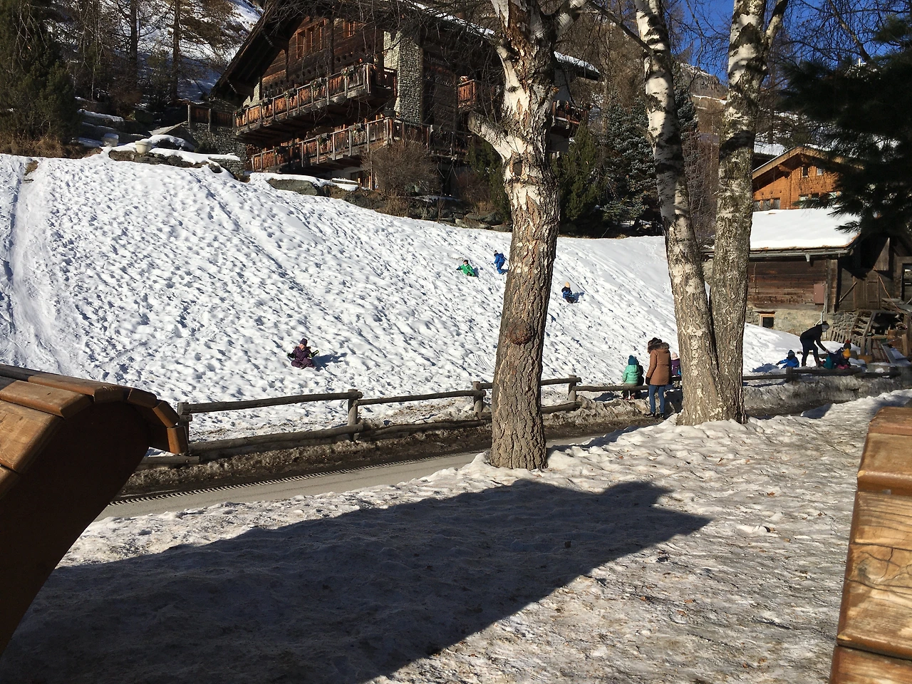 점심을 먹은 후 마터호른이 잘 보이는 자리에 앉아 한참 마터호른을 눈에 담았다. 마터호른을 한참 구경하는데 들려오는 아이들의 웃음소리. 우리가 앉아있던 자리 옆에는 눈이 쌓인 작은 언덕이 있었는데, 거기서 아가들이 신나게 눈썰매 타는 모습이 너무 귀여웠다. 나도 어린 시절에 저렇게 천연 눈 위에서 눈썰매를 탔던 적이 있었나, 주로 인공 눈썰매장을 갔던 것 같은 기억이 나 왠지 부러워지는 기분. 아이들의 귀여운 웃음소리를 귀에 담고, 마터호른을 눈에 담으며 한참 시간을 보내다 숙소로 이동!