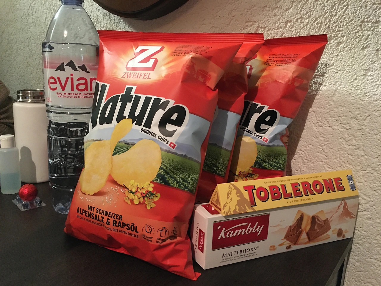 체르마트 저녁 산책을 마치고 저녁을 사러 들어간 Coop. 저녁 먹을거리도 사고 우리가 좋아하는 쯔바이펠 감자칩도 사고, 마터호른 필수 인증샷을 위해 토블론 초콜릿 구매했다. 토블론 외에도 스위스 국민과자 캄블리 마터호른 모양 비스킷이 있기에 다양한 마터호른 인증샷을 위해 함께 구매했다. 내일 마터호른을 만날 만반의 준비를 마치고, 숙소로 돌아와 체르마트 첫째 날을 마무리했다. 첫 만남부터 완벽했던 마터호른, 과연 가까이서 만나는 모습은 어떨까. 설레는 마음으로 마터호른을 만나러 갔던 스위스 고르너그라트 방문기는 다음 글에서!