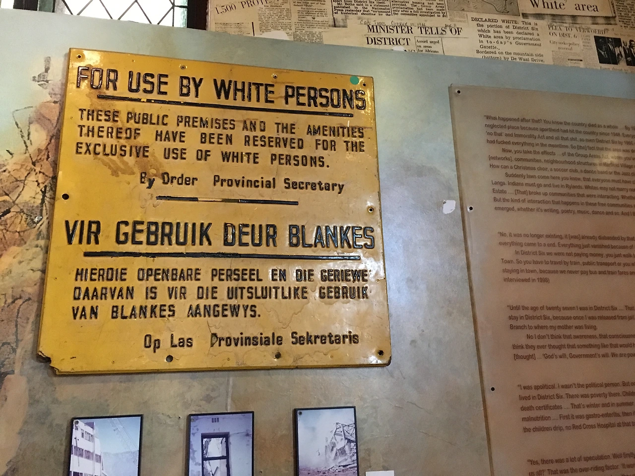 디스트릭트 6 박물관에서는 남아공의 아파르헤이트가 한창이던 시절의 사진과 표지판들, 실제 사용된 물건들, 인터뷰 등을 볼 수 있었다. 아파르헤이트 (Apartheid)는 과거 남아프리카 공화국 백인정권의 유색인종에 대한 차별 정책이다. 인종차별의 극단적인 형태인 아파르헤이트는 법적으로 제도화되어 나라 전반에 걸쳐 차별이 이루어졌으며, 남아프리카 공화국에 심각한 인권 침해와 사회적 불평등을 초래하였다. 그 잔재들은 여전히 곳곳에 남아있다고 하는데, 1948년 부터 46년간 지속된 악랄한 인종차별 정책이 사라진 지 50년도 채 되지 않았으니 그 잔재들이 여전할 수밖에.