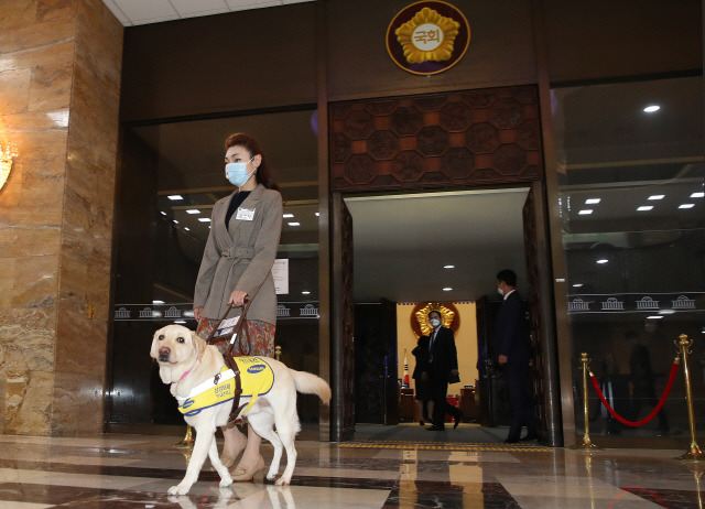 다행히도 21대 국회에서 이런 논의를 하자는 목소리가 나왔습니다. 처음으로 안내견과 함께 국회 입성한 국민의힘 김예지 의원입니다.