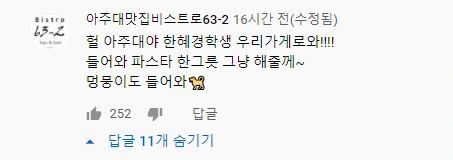유튜브 조회수만 46만회더라고요. 게다가 댓글로 '헐 아주대네. 혜경 학생 우리 가게로 와! 파스타 한 그릇 그냥 해줄게~멍뭉이도 들어와" 이렇게 말해주신 사장님도 있고요. 특히 '파스타' 해주겠다고 하니 더 좋았는데, 혜경 씨도 직접 댓글을 달았더라고요! 두 분의 특별한 만남, 꼭 성사되길 바랍니다. 짝짝!