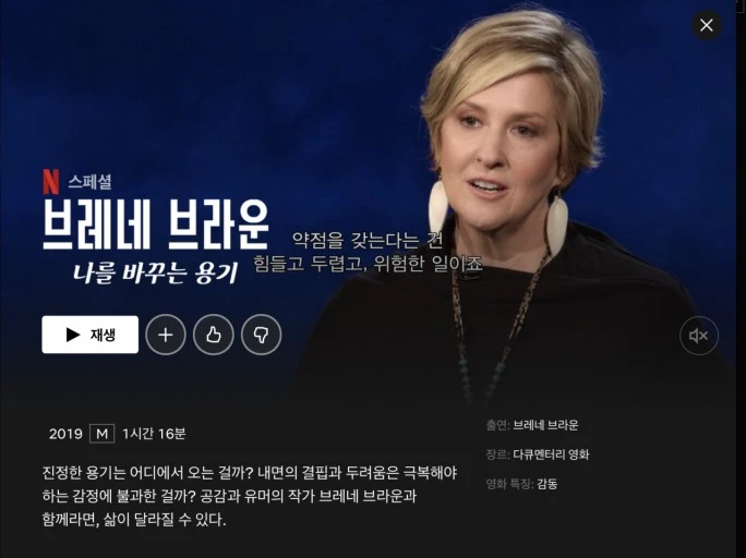 기존 브레네 브라운의 테드 강의는 수 백번 들었는데 Shame Researcher 인 그의 강연이 넷플릭스에도 올라왔네요. 러닝타임 내내 연신 고개를 끄덕이며 봤습니다. 춫천bbbb
