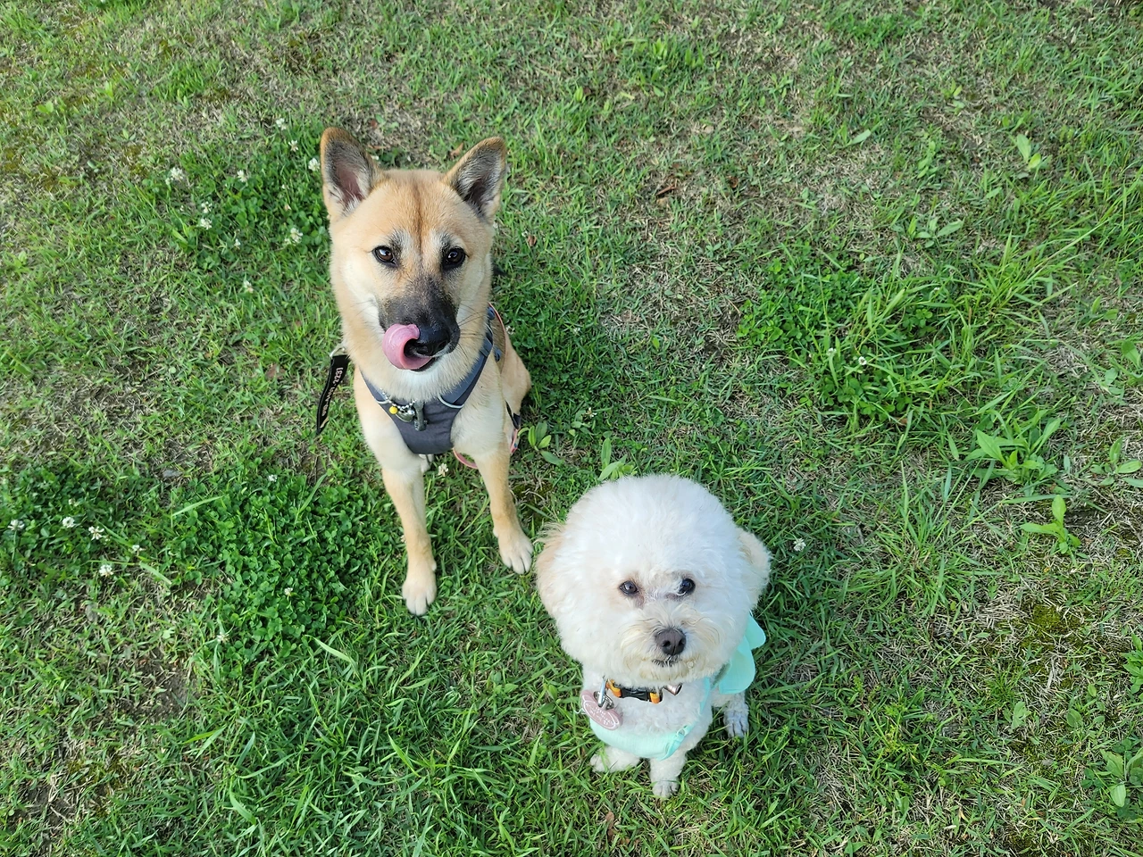 날 좋은 어느 봄날엔, 복주랑 복주 형제들 유기되어 있는 거 구조하고 입양까지 보내 준 천사 같은 언니들하고 언니들이 키우는 갱얼쥐들과 함께 운동장에서 만나 신나게 놀았어요.