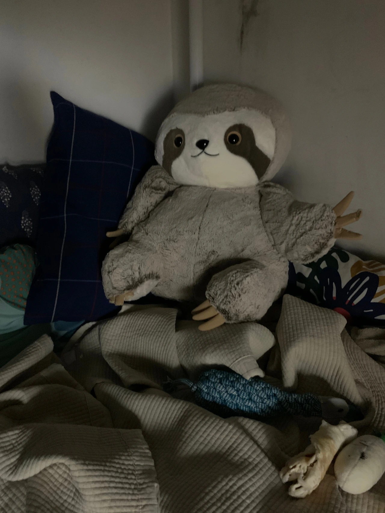산책이 주 업무인 복주는 회복기간 동안 밖에 나가 제대로 놀지 못했고, 그 스트레스를 제 애착 인형인 나무늘보에게 풀었더라고요, 어느 날 새벽 제가 잠든 사이 나무늘보는 복주에게 베란다로 끌려가 손발을 다 뜯기는 고초를 겪어야 했습니다. 요즘은 눈알 적출 시도하네요 ㅠ (이서님 예상 적중)