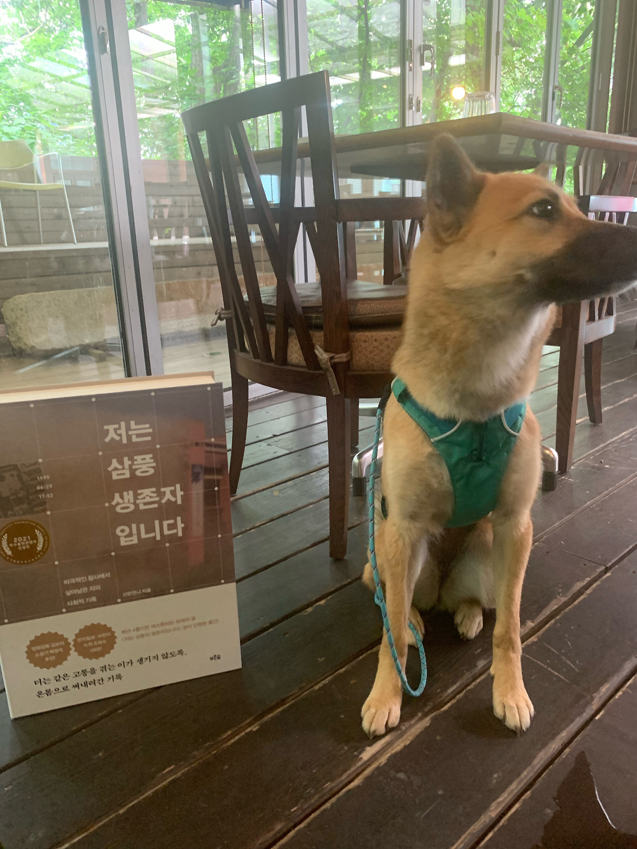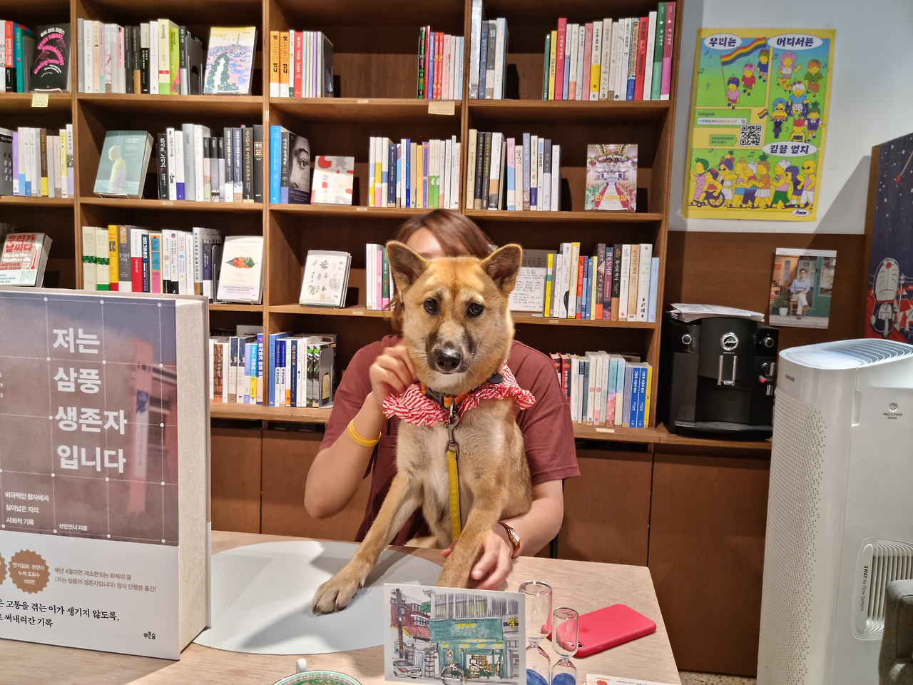 앞서도 말했지만 입양 초기 복주는 혼자 남겨지는 걸 견디지 못했다. 이 또한 전혀 예상하지 못한 일이었다. 난감했다. 커다란 족쇄가 채워진 기분이었다. 그 후 나는 자연스레 외출을 줄였다. 부득이 누군가를 만나야 한다면 그냥 좀 불편하더라도 집으로 손님을 초대했다. 그런데 하필 이 시기가 책 [저는 삼풍 생존자입니다] 출간 시기와 겹쳤다. 개가 집에 오기 전부터 외부 행사는 지방까지 줄줄이 잡혀 있는데 개를 혼자 두고 나는 오도 가도 못하는 신세가 되어 버린 거다. 어쩔 수 없이 출판사에 사정 얘기를 해 양해를 구하고 거의 모든 행사에 복주를 데리고 다녔다. 다행히 당시 담당 편집자가 개를 좋아했다. 다행이지 뭔가. 그래서 내가 녹화를 하거나 강연을 할 때 편집자는 내 개와 공원 산책을 했다.