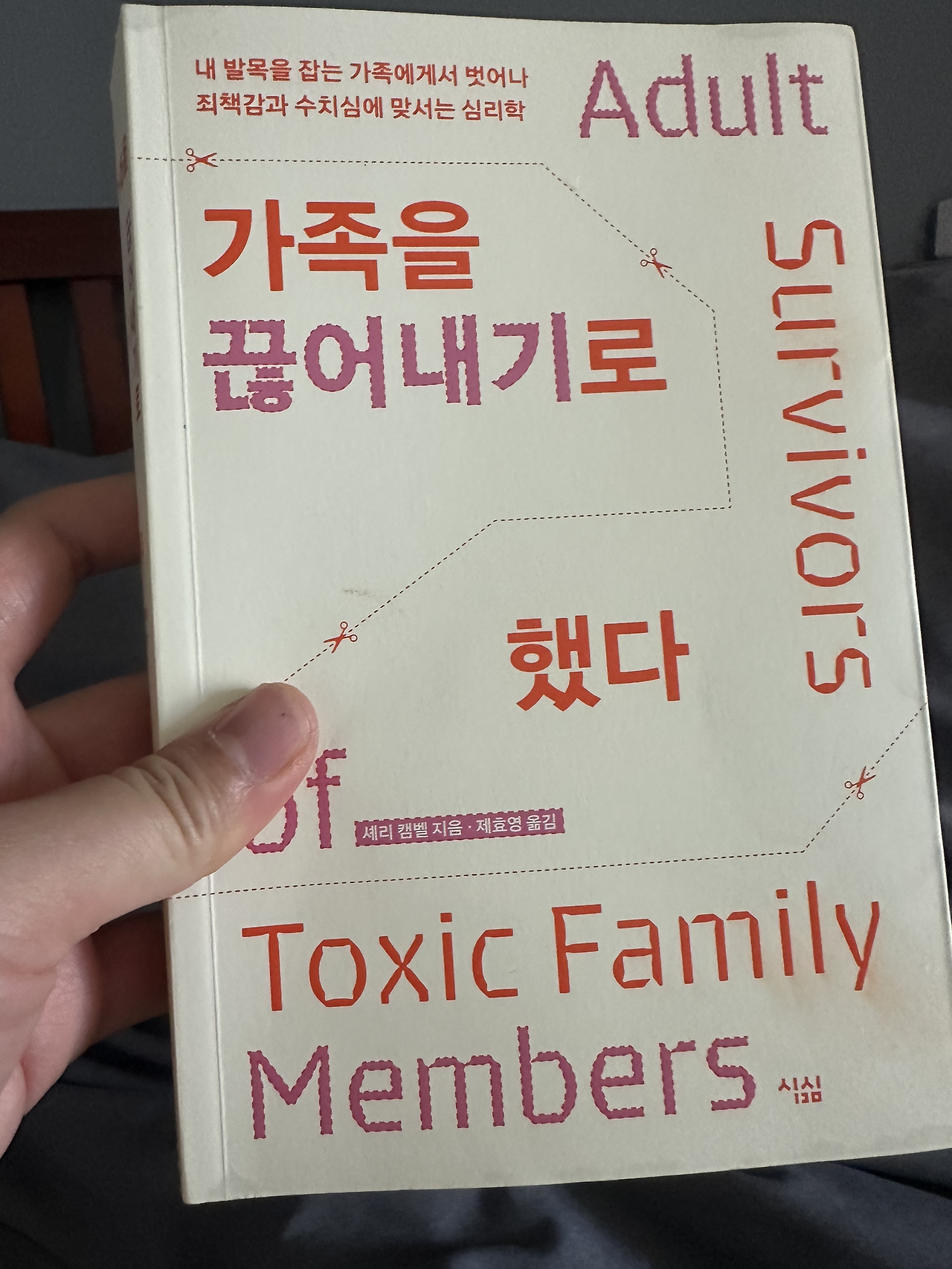 요즘 읽고 있는 책이다. “ 가족을 끊어내기로 했다” 원제는 아마도 Adult Surivivors Of Toxic Familiy Member 아닐까. 국어로는 Toxic을 “해로운” 으로 번역했던데, 딱 맞아떨어지는 번역은 아니라고 생각한다. Toxic은 중독을 기반으로 한 해로움 이니까. 말하자면 중독적이고 유해하다는 것을 알지만 끊어내기 힘든 해로움? 어렵군./머리를 긁적이며/