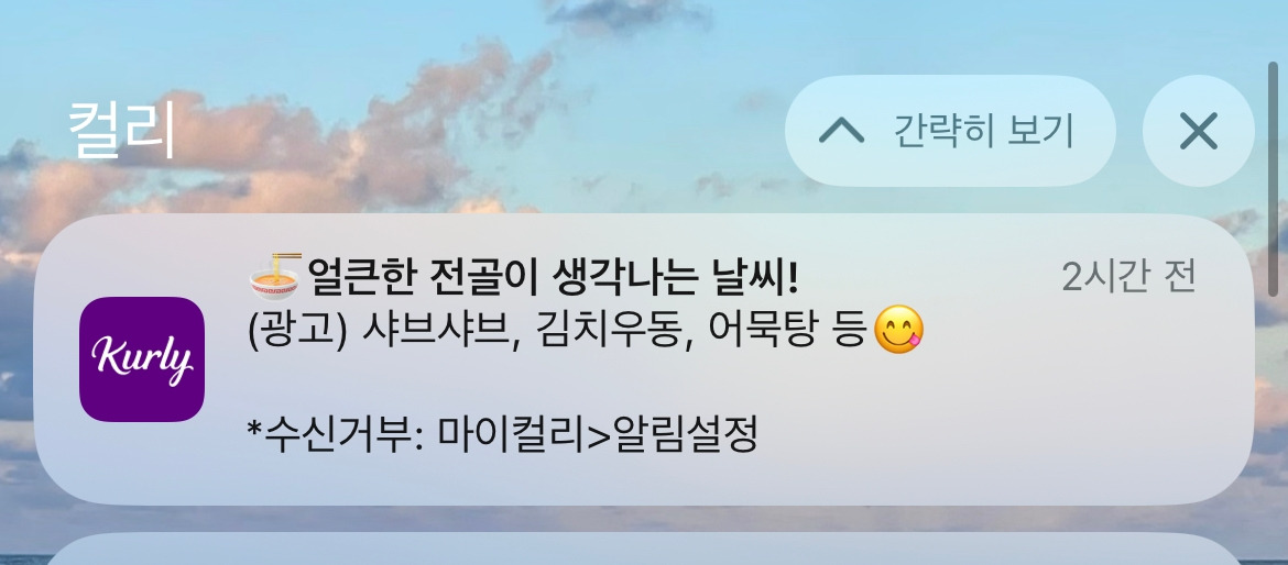 날씨가 갑자기 추워진 날 누를 수밖에 없었던 이 메시지. 추워서 빨간 국물 땡기는 날이었는데 샤브샤브에 김치우동에 어묵탕이라니 이건 못참치. 정확한 시간대는 기억이 나지 않으나 회사에서 집중력이 떨어질 시간대긴 했다. 이렇게 시기적절하게 파고드는 메시지라니 최고bb