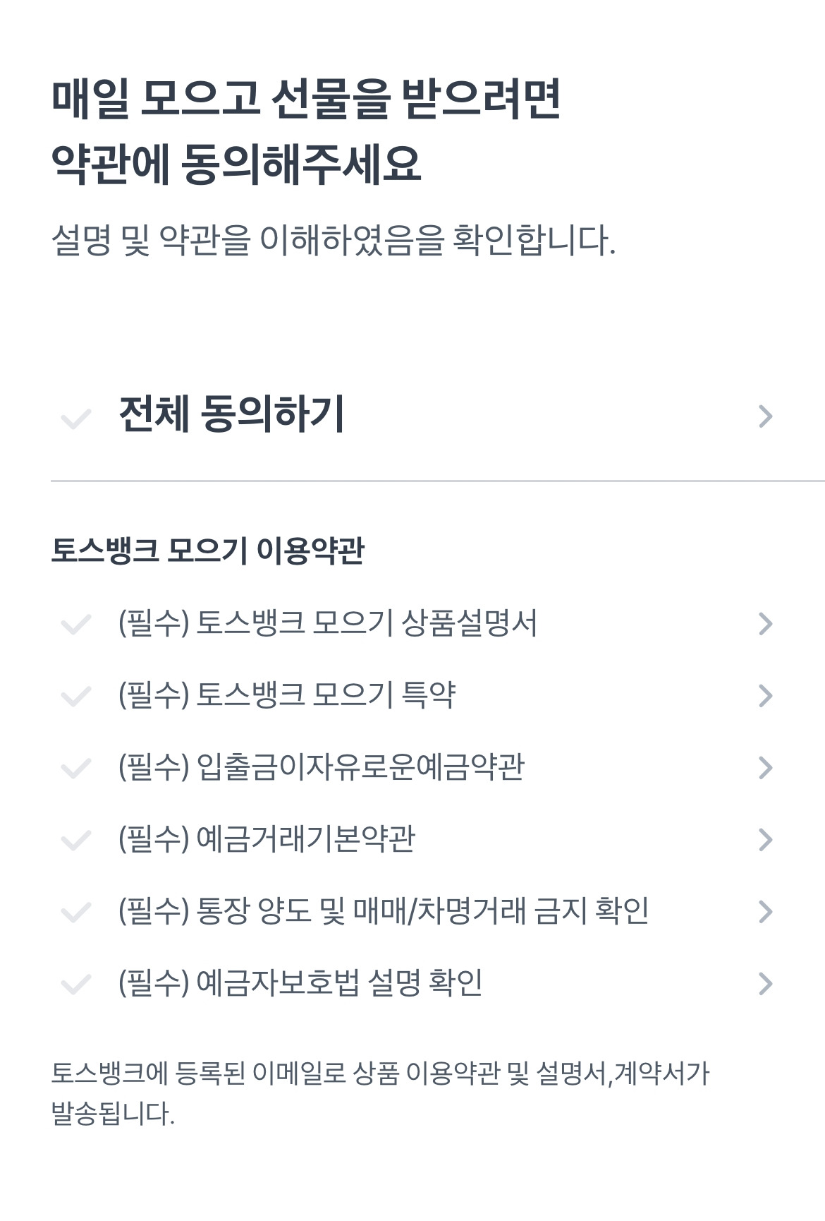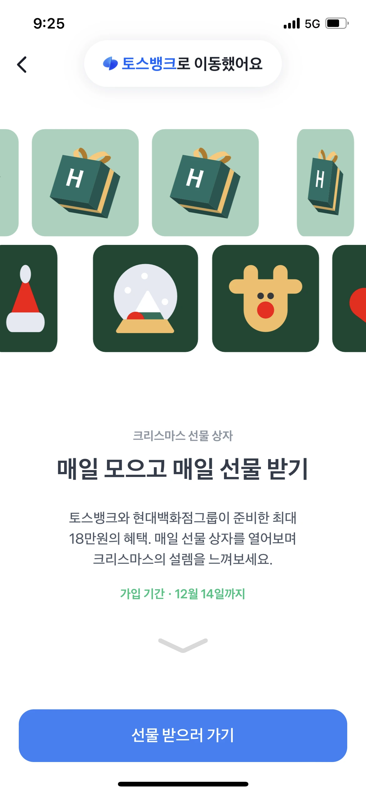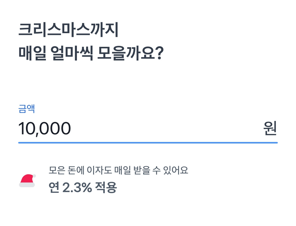 토스에 송금하러 갔다가 눈에 띈 선물 상자. 우선 '선물 상자'라는 카피와 귀여운 이미지에 홀렸다. 당연히 토스의 금융 상품에 가입하는 것이겠거니 생각했으나 본격적인 상품 소개에 앞서 '크리스마스날 사고 싶은 걸 떠올려보세요'라는 카피가 한 페이지를 차지했다. '상품 가입을 유도하겠지?' 싶은 생각에서 '내가 사고 싶은 것'으로 생각의 추를 옮겨오는 과정이 인상적이었다. 이 이벤트에서 토스의 UX적인 강점이 잘 들어난다고 생각하는데, 상품 가입 과정의 주체를 토스가 아닌 사용자가 주체가 되도록 하는 UX가 돋보인다. 특히 '크리스마스까지 매일 얼마씩 모을까요?'와 '매일 모으고 선물을 받으려면 약관에 동의해주세요' 부분!