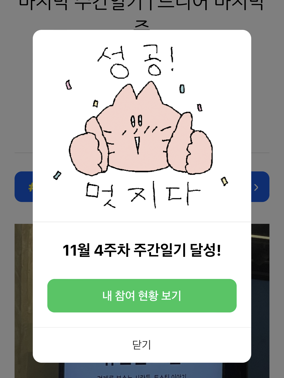 네이버 주간일기의 대장정이 끝났다. 평소 블로그에 일상을 기록하지 않는 편이라 주간일기를 작성하는게 짐같이 느껴지곤 했었는데, 이렇게 한 주차 주간일기를 작성할 때마다 네이버 블로그의 이모티콘이 말하는 응원멘트가 생각보다 힘이 된다. 블로그팀도 이를 예상했기에 이렇게 팝업 창의 절반을 넘게 할애하는 것이겠지?