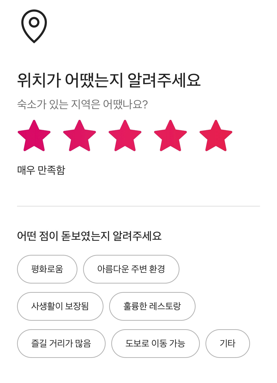 에어비앤비에서 숙박 또는 트립 서비스를 이용하면 늘 후기를 작성하는 편인데 매번 후기 페이지에 감탄한다. 숙소와 숙소 위치, 기물, 호스트와의 커뮤니케이션 만족도를 섬세하게 물어보는 점도 그렇지만 좋았던 포인트를 선택하게끔 하는 점이 특히 그렇다. 캡쳐한 이미지는 '위치' 후기 작성 페이지. 숙소의 위치가 평화로웠는지, 주변에 즐길 거리가 많았는지, 도심지까지 도보로 이동이 가능했는지 여행에 꼭 필요한 정보들을 선택하게끔 했다.
