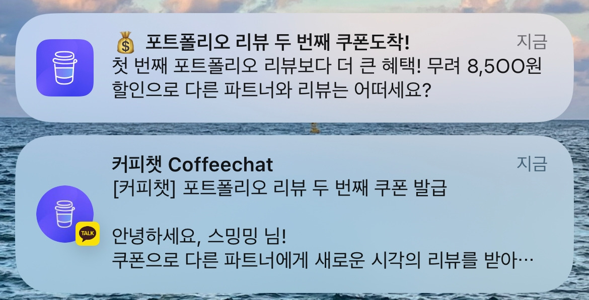 최근 커피챗 서비스로 포트폴리오 리뷰(40분)를 처음 받아 보았다. 충분한 시간이라고 생각했는데 생각보다 시간이 촉박해 아쉬운 상태로 통화를 끝낼 수 밖에 없었다. '아쉽다'라고 생각이 들때쯤 날아온 포트폴리오 리뷰 할인 쿠폰. 푸시 메시지와 카카오톡으로 포트폴리오 리뷰를 힌 번 더 받아보라며 날아온 쿠폰에 마음을 들킨 것 같아 놀랐다. 그리고 찰나를 놓치지 않는 타이밍에 내 마음도 흔들리기 시작했다. 결국 포트폴리오 리뷰 한 번만 받아보고 앱을 삭제하려던 원래의 마음은 사라지고, 지금은 다른 파트너에게 리뷰를 한 번 더 받아볼까 고민하는 중이다. 역시 쿠폰은 타이밍!