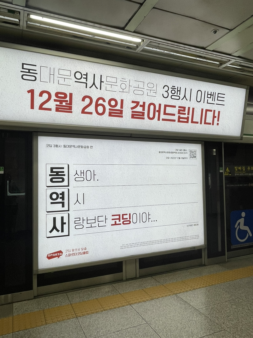 동대문역사공원역에서 발견한 코딩 교육 서비스 '스파르타코딩클럽'의 옥외 광고. 옥외 광고를 특이하게 참여형 이벤트로 풀어낸 점이 신기했다. 브랜드의 핵심 키워드 '코딩'을 넣어 삼행시를 적어주면 선정해 광고를 걸어주는 방식인데, 삼행시라는 사람들이 친근하게 여기는 소재로 시선을 잡아끌고 > 브랜드와 브랜드의 서비스를 인지시킬 수 있는 좋은 광고라는 생각이 든다.