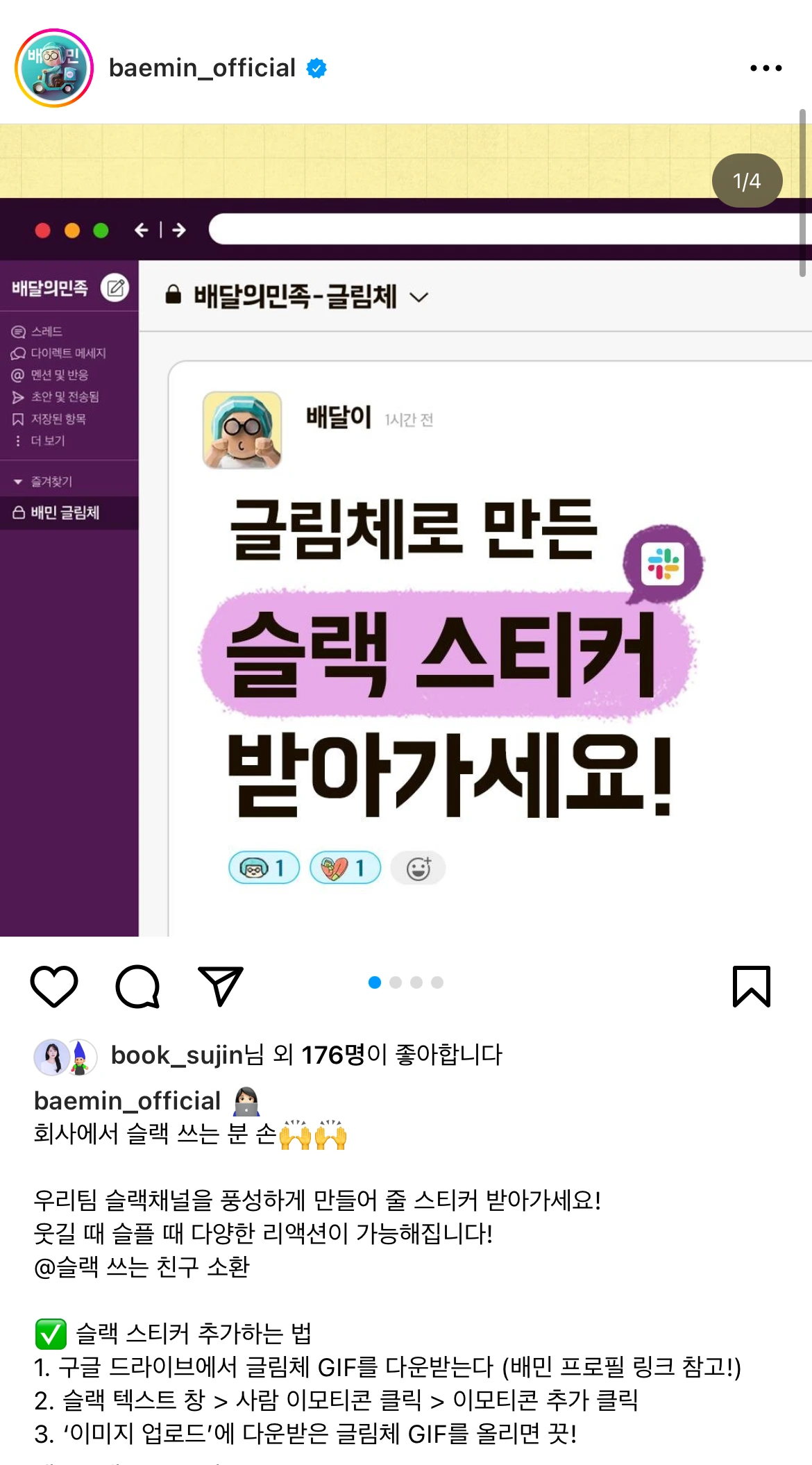 보자마자 감탄이 나온 배민의 '글림체' 슬랙 스티커 배포. 내가 못봤을 수도 있지만 브랜드에서 슬랙 스티커 배포하는 건 처음 본다. 처음에 배민 글림체가 나왔을 때 너무 그림에 가까운 글씨체라 폰트 활용도를 어떤 식으로 가져갈지 궁금했었다. 그런데 이렇게 이모티콘(스티커)로 풀어내다니! 인스타그램 게시글에 스티커 추가하는 방법까지 언급해줘서 섬세함도 돋보인다.