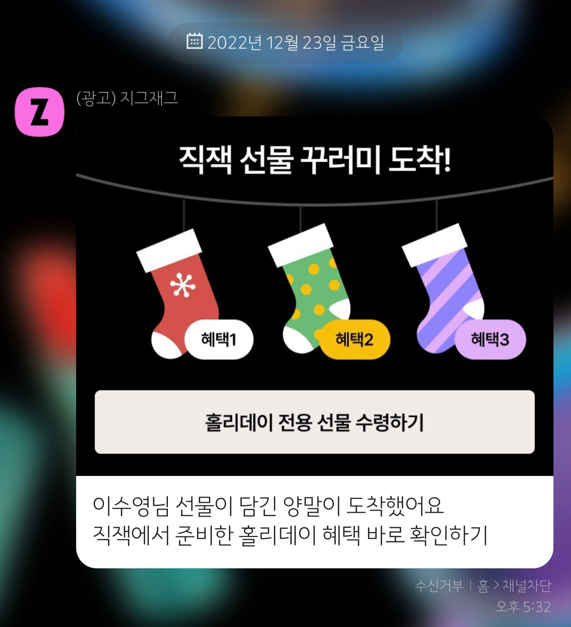 패션 커머스의 대목인 크리스마스 시즌. 요즘 카카오톡 메시지가 쏟아지고 있다. 너무 많이 오기도 하고 지금은 옷을 구매할 생각이 별로 없어서 넘기는 편인데, 다 알면서도 클릭할 수밖에 없었던 지그재그의 양말 메시지. 어차피 열어보면 내가 쓸 가능성이 낮은 할인 쿠폰일텐데도 버튼을 누른 이유는 크리스마스 선물을 연상하게 하는 '양말' 때문이었다.