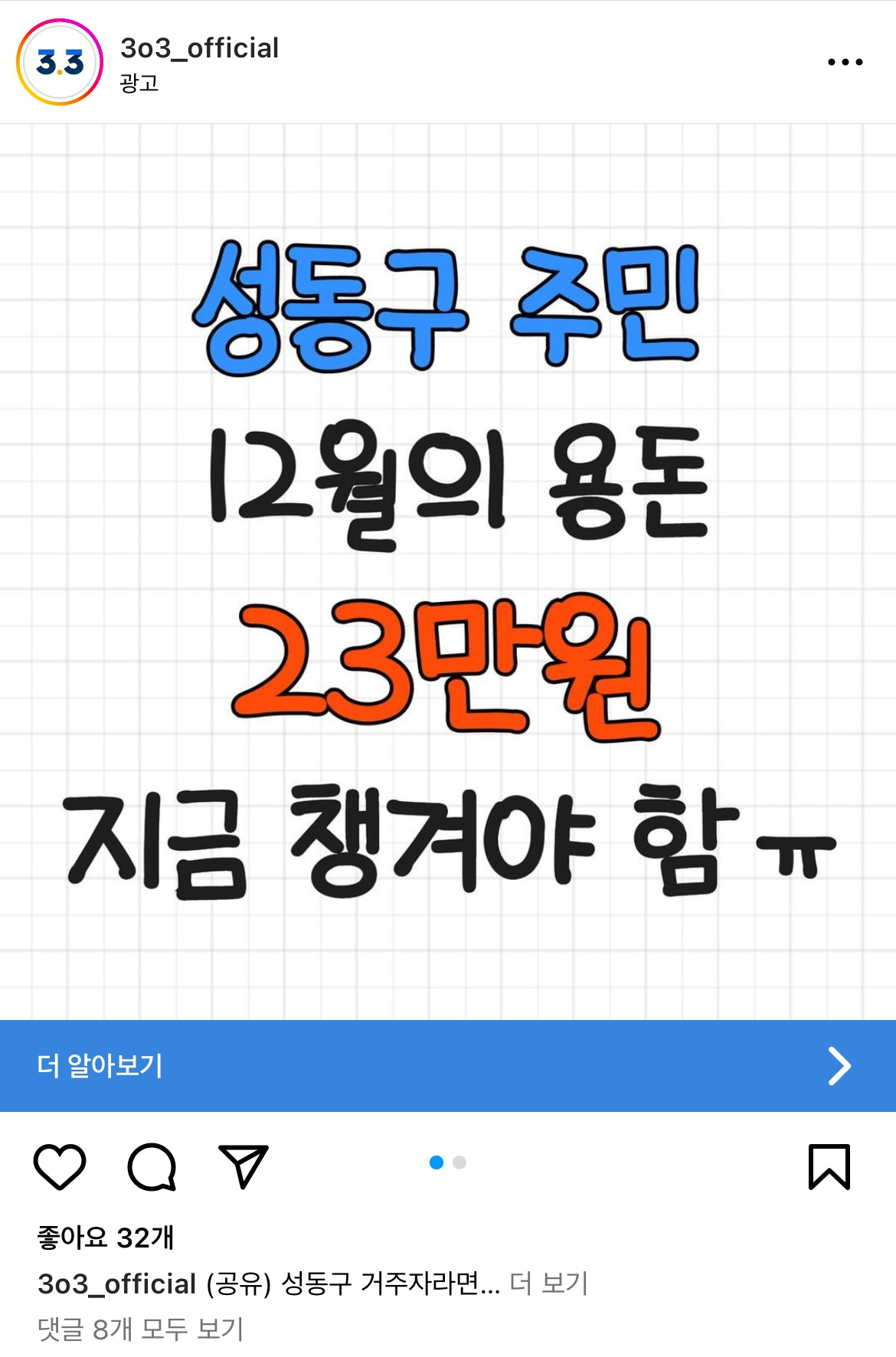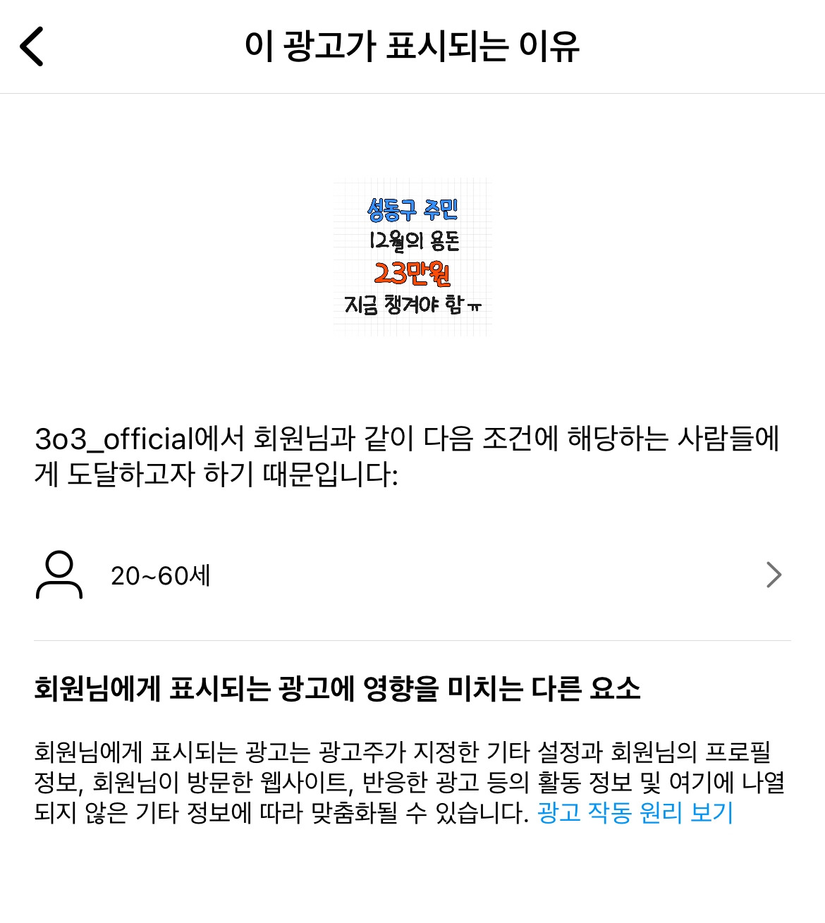 간편 세무 서비스 '삼쩜삼'은 언제나 고객이 받을 수 있는 환급세액을 '용돈', 내가 받을 수 있는 '혜택'으로 개념을 치환해 메시지를 던지는 서비스다. 매년 직장에서 연말정산을 하는 내게는 해당되지 않는 내용이지만 그럼에도 불구하고 꼭 스크롤을 멈출만큼 매력적이다. 12월의 용돈, 23만원이라니. 게다가 내가 살고있는 구는 또 어떻게 알고? 광고 이미지 자체가 인스타 '탐색 탭' 상위를 차지하고 있는 인기 많은 게시물 이미지를 닯기도 했다. '성동구'라는 구체적인 지명이 들어가 있어 '이 광고가 표시되는 이유'를 살펴봤지만 조건은 20~60세 뿐이었다. 어떻게 설정한 건지, 서울의 모든 구를 대상으로 하는 건지, 상대적으로 서비스를 이용하지 않는 지역을 몇 개 추려 광고를 돌린 건지 궁금해진 광고.
