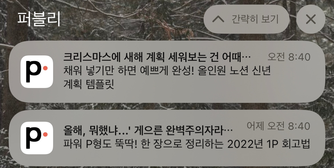 퍼블리는 오전 8:40마다 앱 푸시 메시지를 보내는데 메시지 제목이 자꾸 잘려서 온다. 기종별로 테스트를 하지 않는 건지 일부러 의도한 건지 궁금하다. 메시지 내용도 아리까리하다. 코로나도 풀려서 놀기 바쁠 올해 크리스마스인데 새해 계획을 세워보라고 하지 않나, 2022년 1P 회고법이래서 마케팅 4P 같은 공식을 이야기 하는 건가 했지만 다시 읽어보니 페이지였다. 페이지를 표시할 때는 보통 p로 표시하는 거 아니였는지.