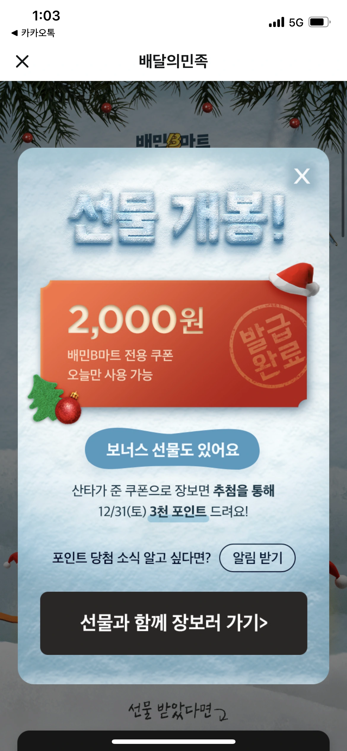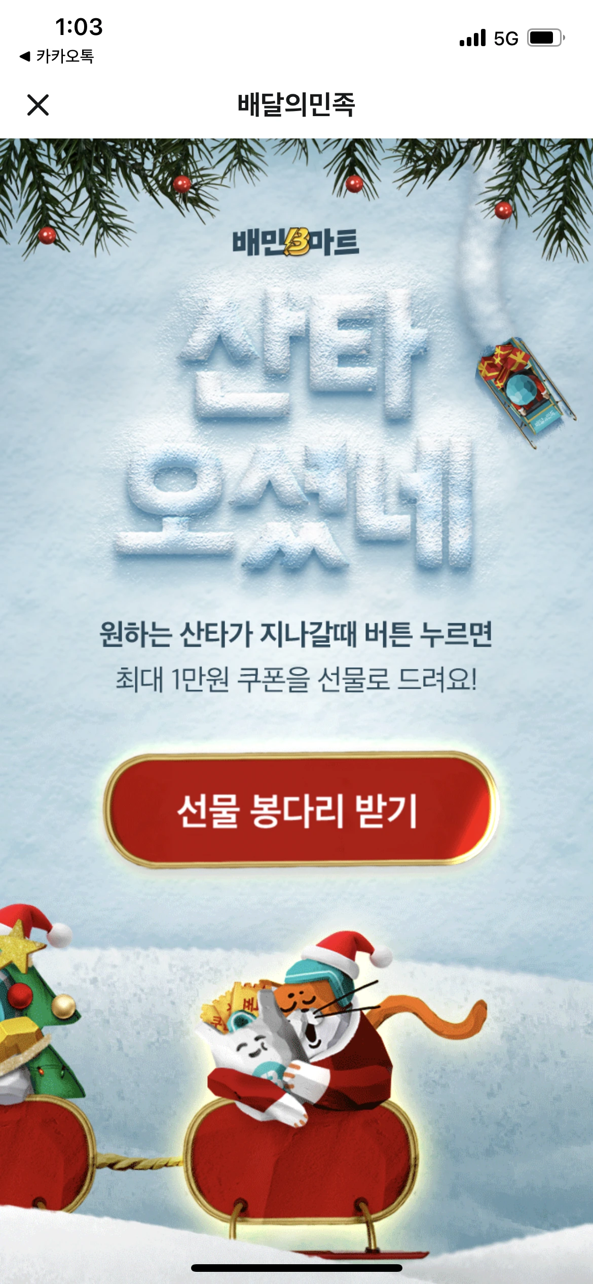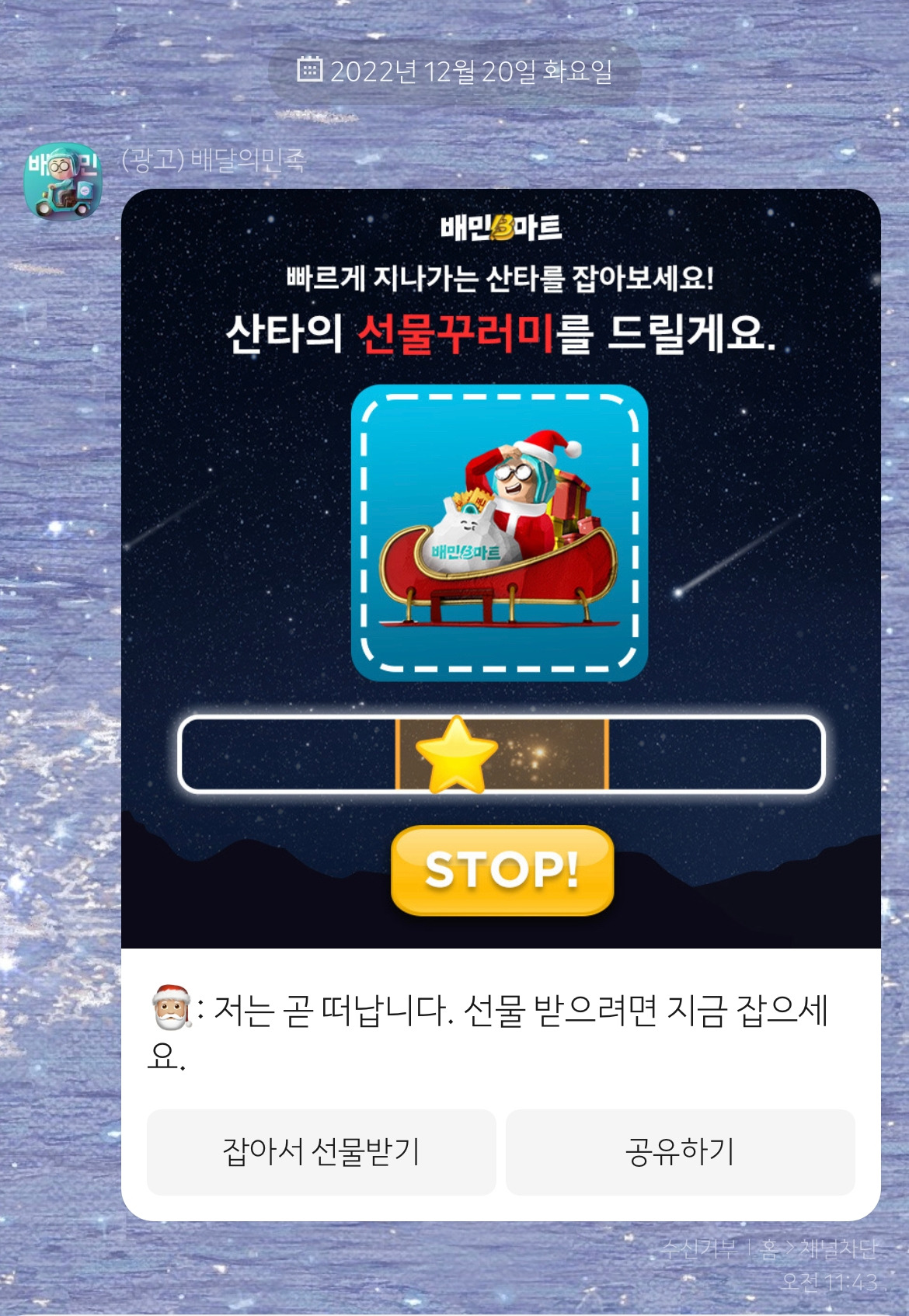 배달의민족은 시즌성 프로모션을 많이 하는 서비스인데, 뻔하게 보일 수 있는 프로모션도 새로운 컨셉과 눈에 띄는 디자인 크리에이티브로 진행한다. 이번에도 역시 다들 하는 크리스마스 시즌 매출 증대 프로모션을 '지나가는 산타 잡기' 게임 이벤트로 다르게 진행했다. 어렸을 때 하던 추억게임 '타이밍 맞춰 버튼 누르기 게임'은 비마트에 큰 관심이 없는 고객이라도 한 번 들어가 보지 않을까? 카카오톡으로 온 메시지도 명확하고 재치있다. '지금', '곧 떠난다'라는 단어로 게임에 지금 참여해야 하는 명분을 제공했고, 어떤 게임인지 바로 이해할 수 있는 이미지로 이해를 도왔다.
