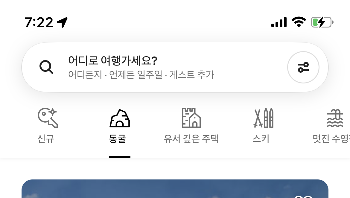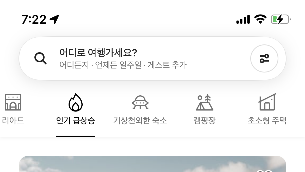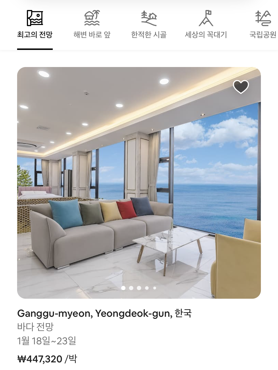 저번에 머문 후기 쓰러 갔다가 숙소의 경치에 넋을 잃어버리고 다음 여행할 곳을 찾고 있던 나.. 이건 홈 화면에 멋진 숙소만 보여주는 에어비앤비 탓이다. 이왕 앱에 들어온 김에 앱 구석구석을 돌아봤다. 홈 화면 큐레이션 탭은 한 번도 스크롤 한 적 없었는데 생각보다 다양한 카테고리가 있었다. 새로 등록된 숙소, 동굴, 유서 깊은 주택 뿐만 아니라 인기 급상승, 기상천외한 숙소 등. 꼭 숙소 예약이 아니더라도 여행과 숙소를 좋아하는 사람들이라면 체류시간이 엄청나게 늘어나지 않는 기획이었을까 생각했다. 내가 거의 1시간을 숙소만 보고 있던 것처럼.