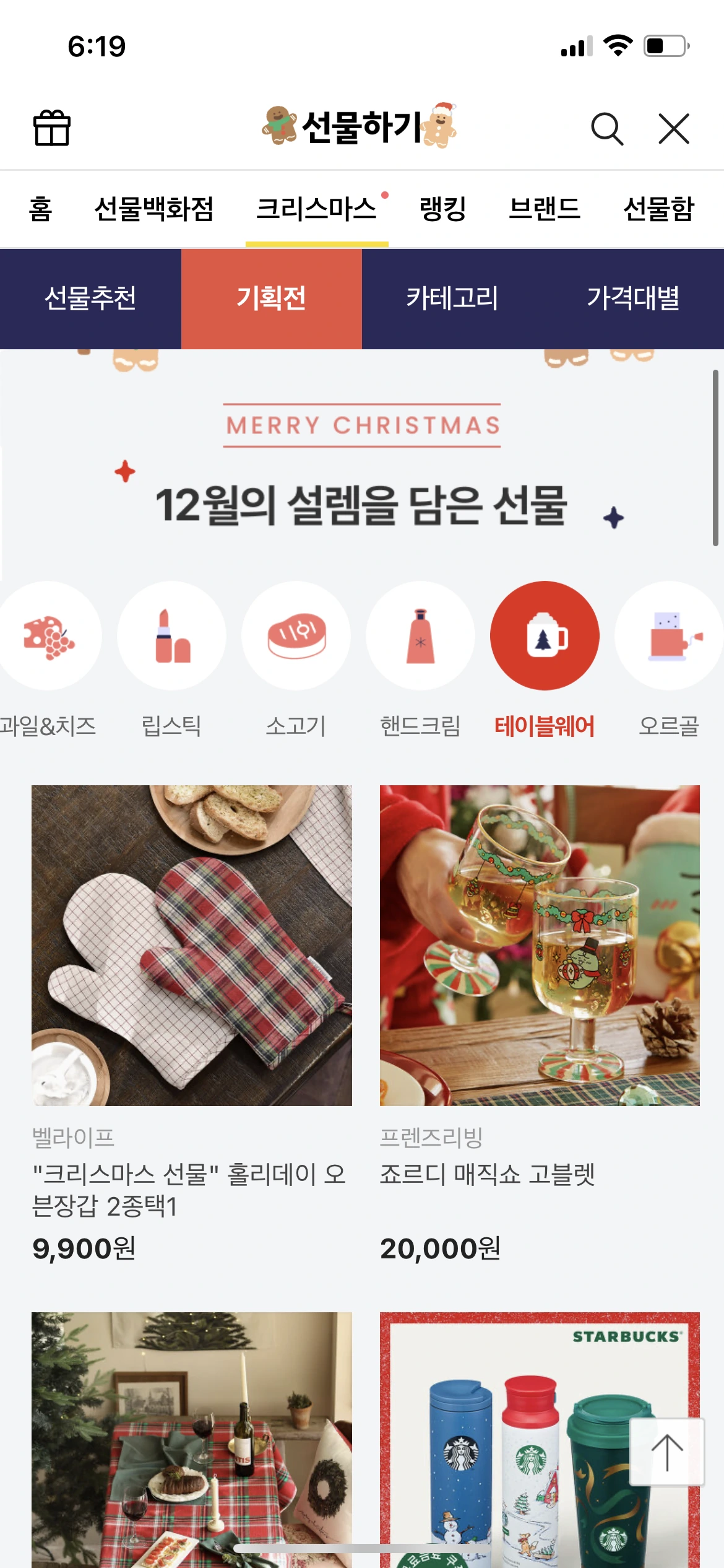 괜히 누구에게 선물하고 싶은 크리스마스 시즌. 카카오 선물하기는 더 잘 선물할 수 있도록 연말 선물 큐레이션을 보여주고 있다. 기본적으로 케이크부터 주얼리, 디저트, 립스틱, 소고기 선물을 고를 수 있는데 '오르골'이나 '테이블웨어' 카테고리가 있는 점이 새로웠다.