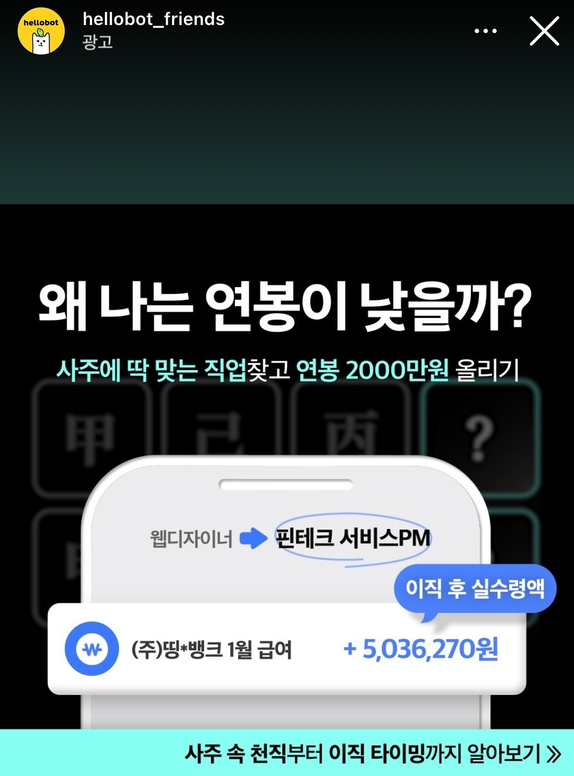 보자마자 커리어 관련 광고인지 알았는데 사주 광고라서 놀랐다. 사주, 신점에 관심이 많을 수 있는 이직 시점, 커리어 고민 시점을 타깃 한 광고 같은데 소재를 이렇게 풀어내는 게 신기하고 눈에 띈다. 다만, ‘사주에 딱 맞는 직업 찾고 연봉 올리기’라는 메시지가 과연 유효할지는 잘 모르겠다. 마케터로 일하고 있는 마케터의 다른 직무로 변경하는 것도 어려운 일이라고 생각하는데, 직업도 변경해야 할 수도 있다는 말이 그렇게 와닿지는 않았다. ‘직업’ 같은 큰 단위의 말보단 차라리 바로 적용할 수 있는 일상 단위의 이야기면 어땠을까 싶은 마음.