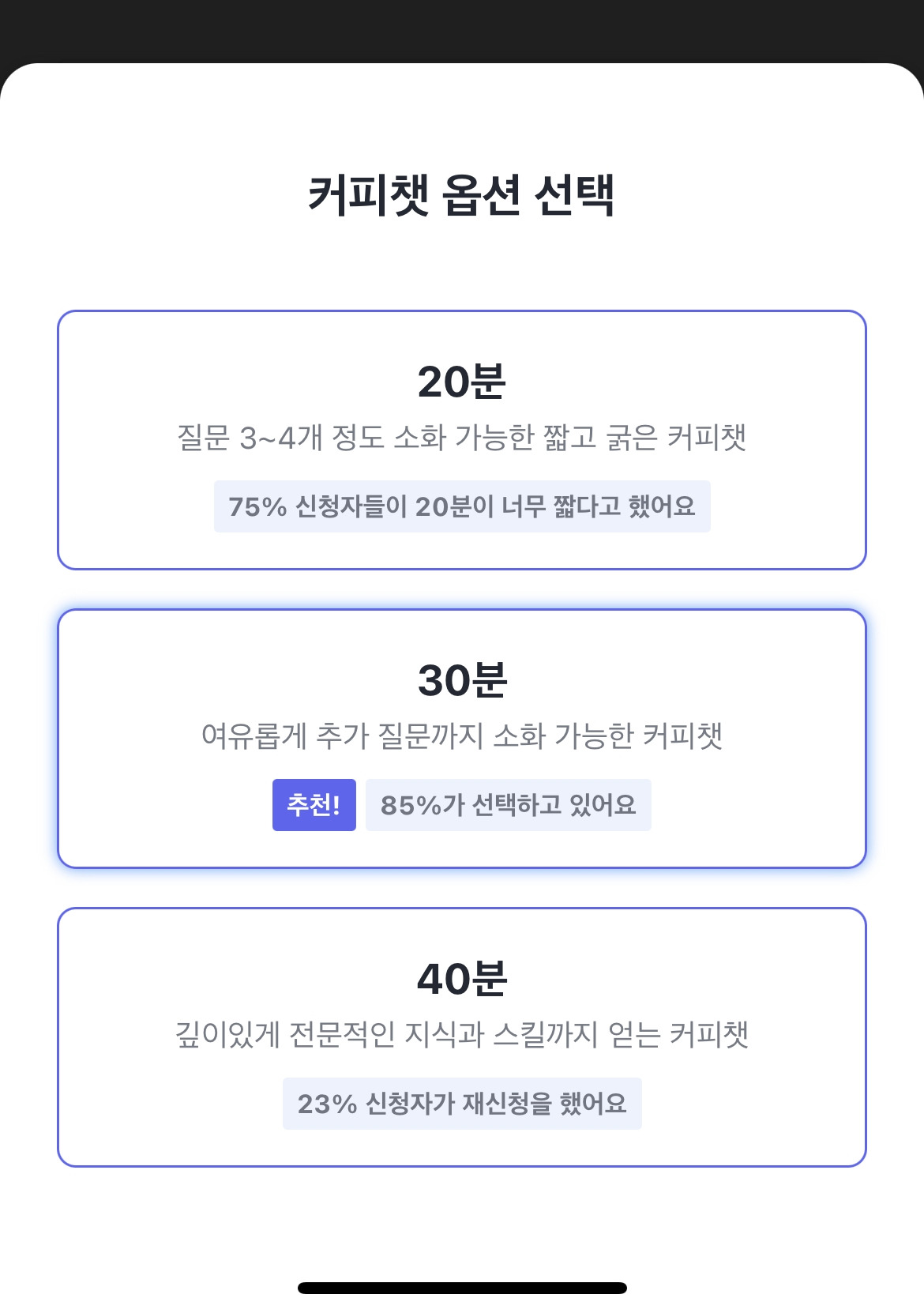 현직자와 커피챗 및 포트폴리오 리뷰를 받을 수 있는 서비스, 커피챗은 시간 단위로 결제를 해야 하는 시스템이다. 그런데 맨 처음 이 서비스를 이용할 땐, 어느 정도의 시간이 필요할지 감이 없다. 아마 옵션 중 제일 적은 시간을 선택할 사람들도 많을 것이다. 하지만 서비스든, 파트너든 더 긴 시간을 하는 게 더 좋을 것. 그래서 중간 옵션을 ‘85퍼센트 사람들이 선택한다’는 객관적인 지표를 들어 보여준다. 가장 저렴한 옵션은 ‘75퍼센트가 너무 짧다고 했다’는 말을 덧붙여 더 긴 시간을 선택하게끔 한다. 딱 한 줄씩이지만 충분히 고객의 마음이 바뀔 수 있는 순간!