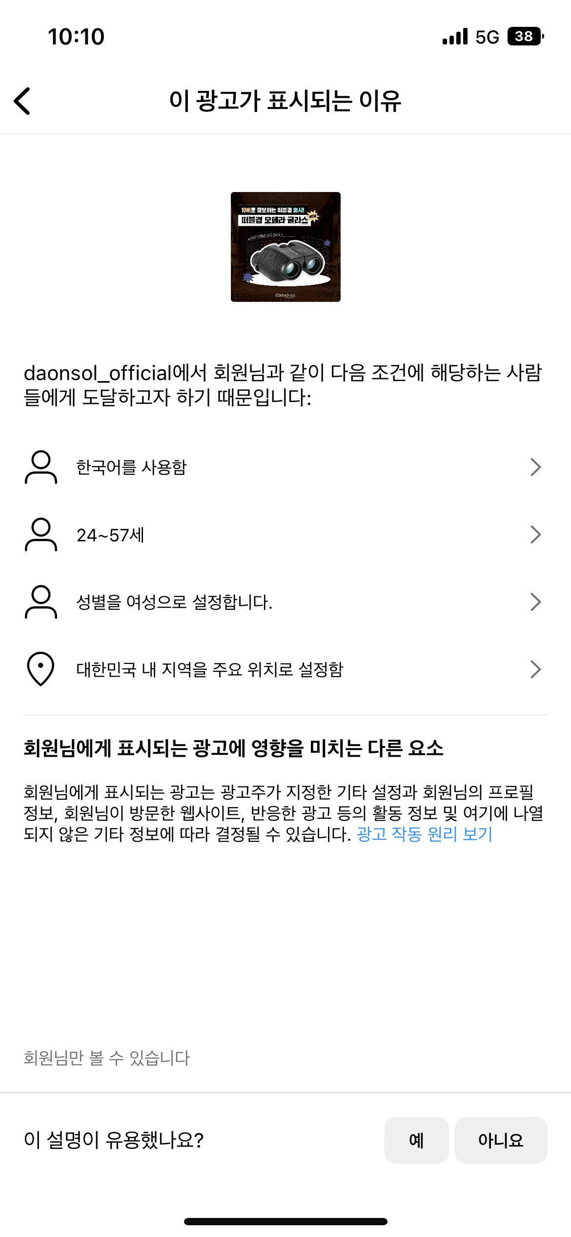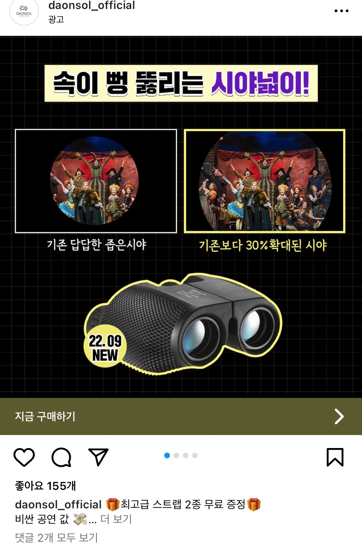 오페라글라스를 자주 쓰는 (티켓팅을 잘 못하는) 연뮤덕으로 이 광고가 정말 좋았는데, 페인 포인트를 정확히 담아냈다. 먼저 가장 중요한 시야 넓이. 보통 오페라글라스로 무대를 보면 광고의 왼편처럼 동그랗게 보이는 게 전부라 답답하다. 그런데 그게 오른쪽 이미지처럼 확대될 수 있다니. 광고에 시선이 갈 수밖에 없었다. 두 번째로는 글라스 측면 사진이다. 장시간 들고 있어야 하는 글라스 특성상 그립감이 정말 중요한데, 오페라글라스 이미지를 옆이 보이게 해 오돌토돌한 면이 잘 보인다. 절대 미끄러지지 않을 것 같은 느낌을 준다. 세 번째로는 최고급 스트랩 증정이라는 문구다. 공연 내내 목에 걸고 있고, 무게가 생각보다 있어 스트랩이 중요한데 이걸 두 개나 준다니, 엄청난 혜택이다. 몇 년 몇 월에 새로 나왔는지 배지로 알려주는 것도 좋다. 연뮤덕은 때가 되면 새로운 오페라글라스를 사기 마련인데, 내가 마지막으로 구매한 오페라글라스가 언제였는지 반추해 보고 구매를 결정할 수 있기 때문이다. 카피부터 문구, 이미지까지 모두 완벽했던 광고.