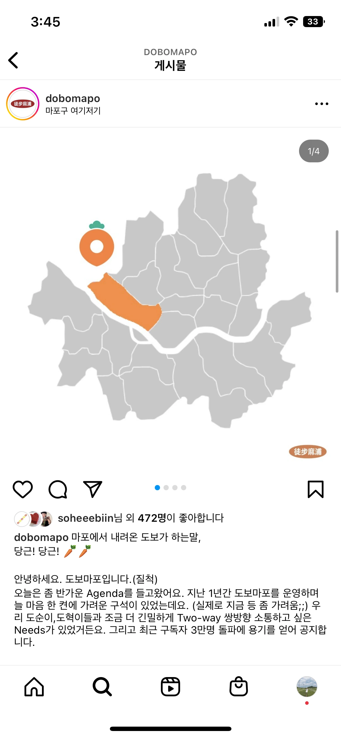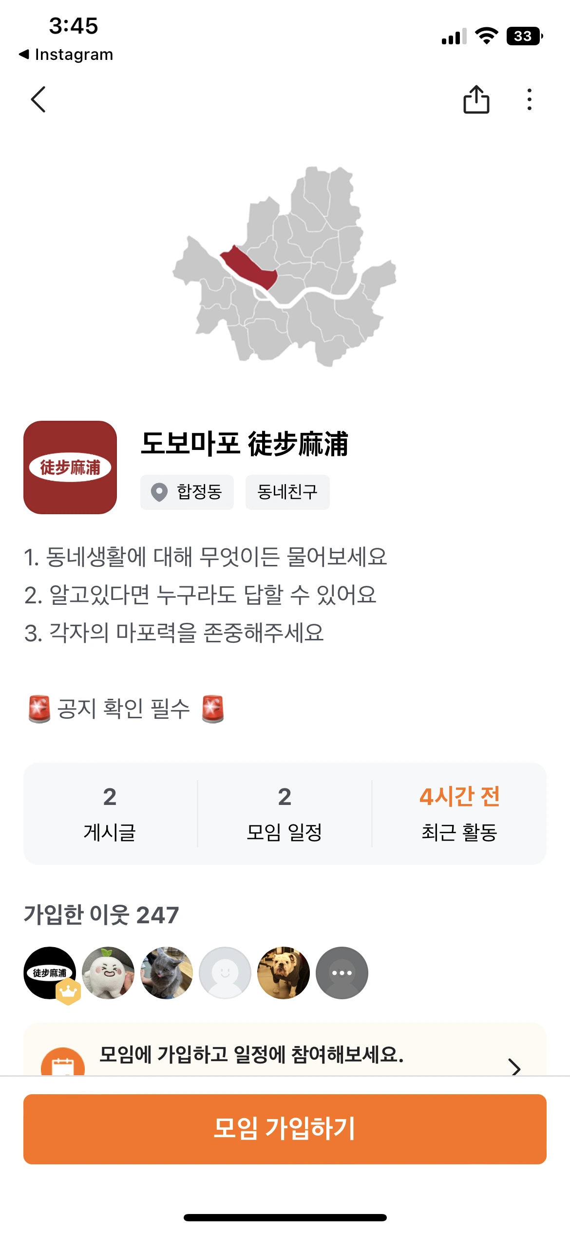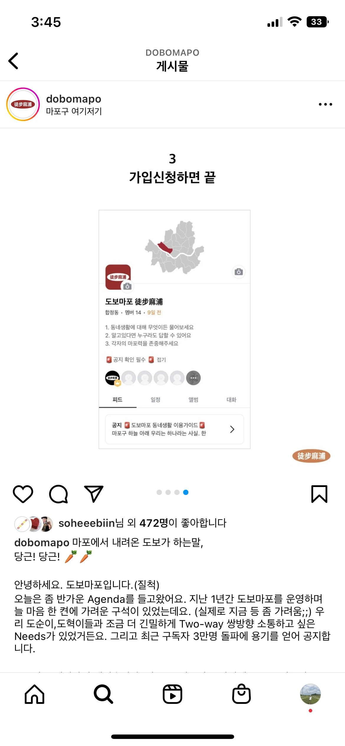 성수 로컬 이야기를 전해주는 제레 님(@zele._. park)을 시작으로 각 지역마다 로컬 큐레이터들이 인기다. 마포에서 주로 활동하는 도보마포(@dobomapo)도 그중 유명한 로컬 인플루언서. 보통 카카오톡 오픈 채팅방을 여는 추세지만, 도보마포는 당근마켓과 협업해 당근마켓 안에 모임을 열었다. 다른 오픈 채팅방과 다른 점은 당근마켓 지역 인증을 해야만 모임에 가입할 수 있다는 점. 찐 지역민들이 모인 커뮤니티라 정보 공유의 질과 양이 남다를 것 같고, 당근마켓과 도보마포가 서로 윈윈할 수 있는 콜라보레이션 같다.