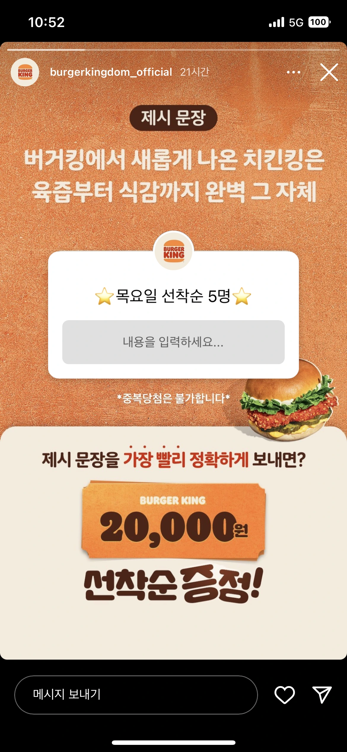 버거킹이 요즘 재밌는 이벤트를 많이 진행하는데, 이번에는 스토리로 한컴타자연습같은 이벤트를 실시했다. ‘버거킹에서 새롭게 나온 치킨킹은 육즙부터 식감까지 완벽 그 자체’라는 문장을 정확하고 빠르게 친 선착순 5명에게 버거킹 상품권을 주는 이벤트다. 댓글이 아닌 스토리 이벤트이기 때문에 사람들은 자신이 선착순에 들었는지 알 수 없다. 그렇기에 많은 사람들이 이 문장을 타이핑해 메시지를 보낼 것이다. 그리고 타이핑하면서 새로 나온 햄버거 ‘치킨킹’의 맛을 한 번쯤은 생각할 것이다. 그렇게 고객에게 신제품을 한 번 더 인지하게 할 수 있는 이벤트.