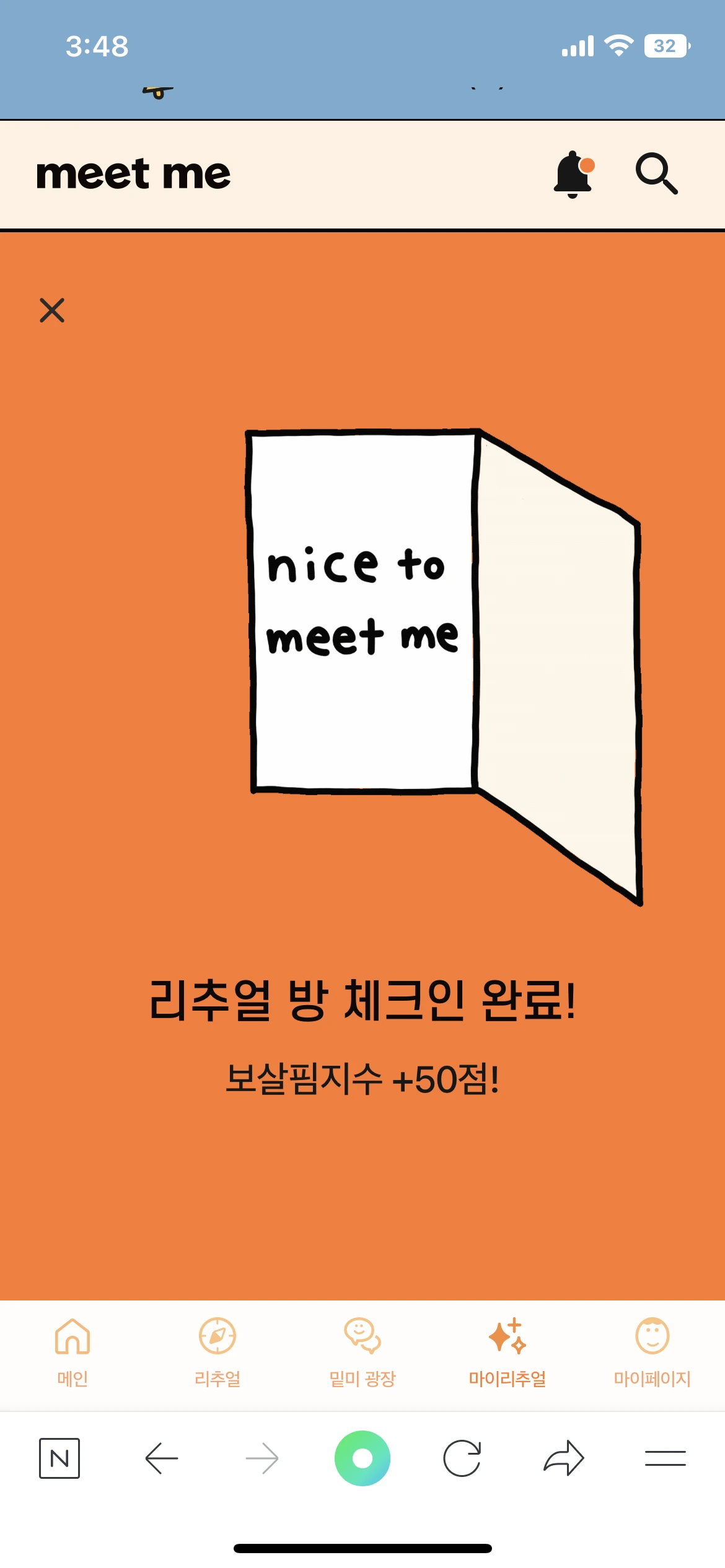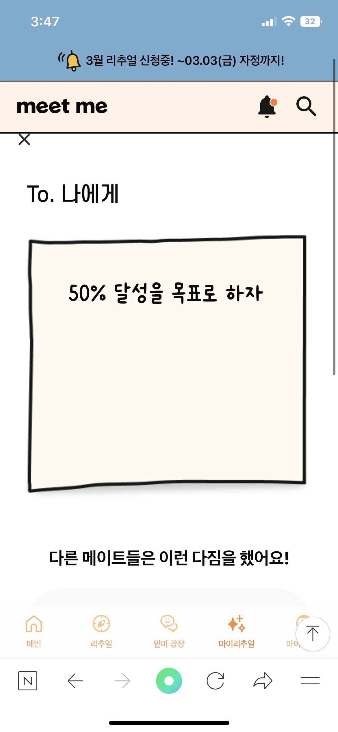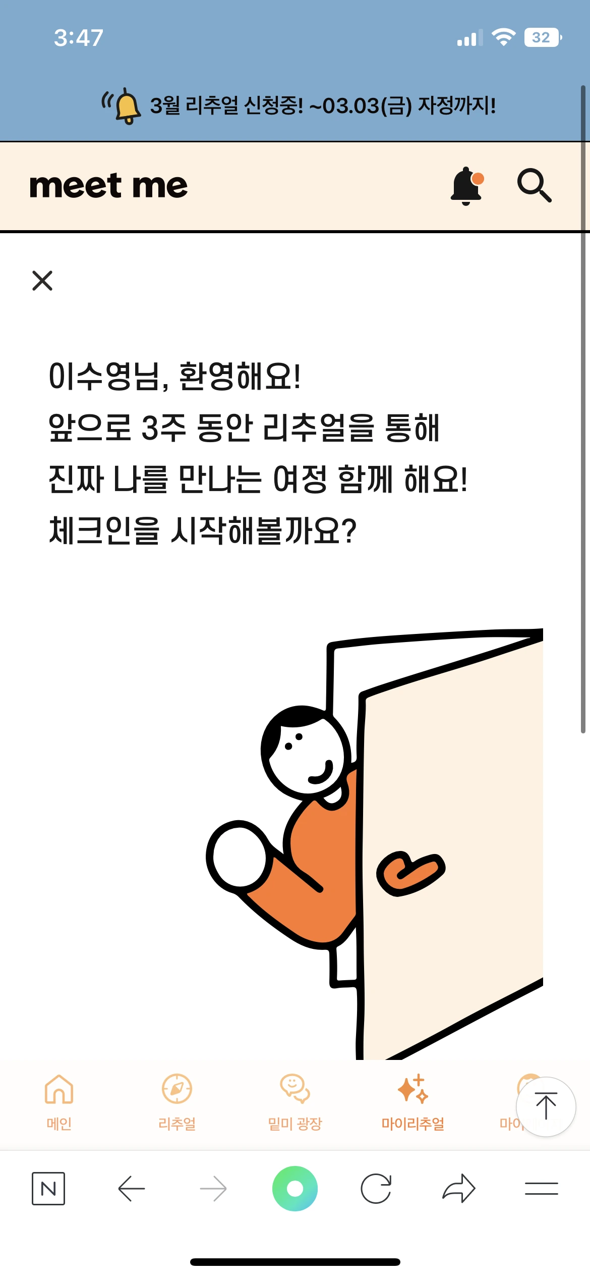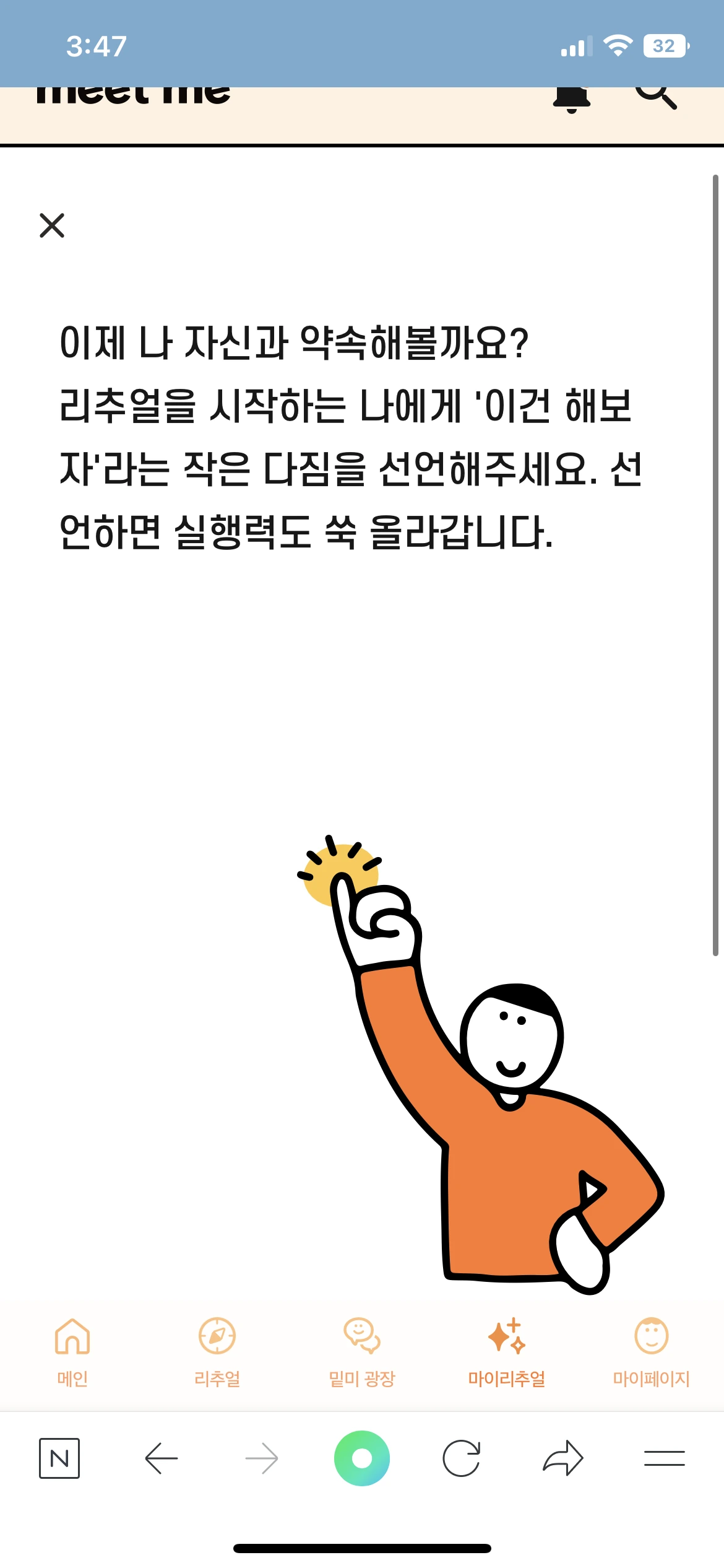 자아실현 큐레이션 서비스, 밑미에 새로운 온보딩이 생겼다. 리추얼 참여가 처음인 사람들이 당황하지 않도록, 작은 다짐을 세우고 다른 메이트들의 다짐도 확인할 수 있게 하는 요소! 밑미는 일 년 반 넘게 이용하고 있는 서비스인데, 가끔씩은 처음 해보는 리추얼을 어떻게 시작해야 할지 막막할 때가 있었다. 그래서 이번에 새로 생긴 온보딩이 좋았다. 별 게 아닌 것처럼 보이지만 참여자들로 하여금 안심할 수 있게 만들어 주는 것 같아서다. 온보딩 프로세스에 전반적으로 브랜드 아이덴티티가 묻어나는 것도 좋았음!
