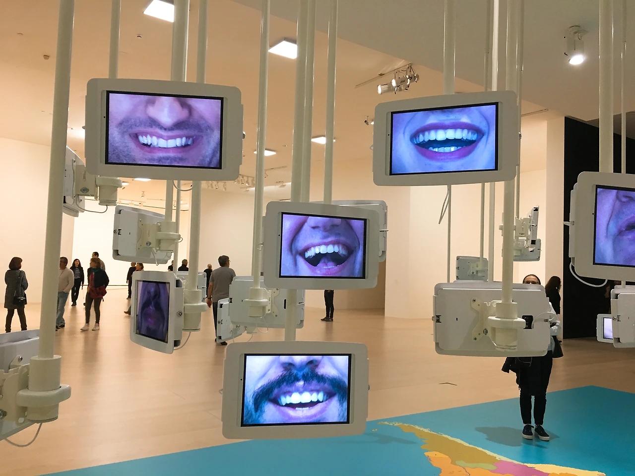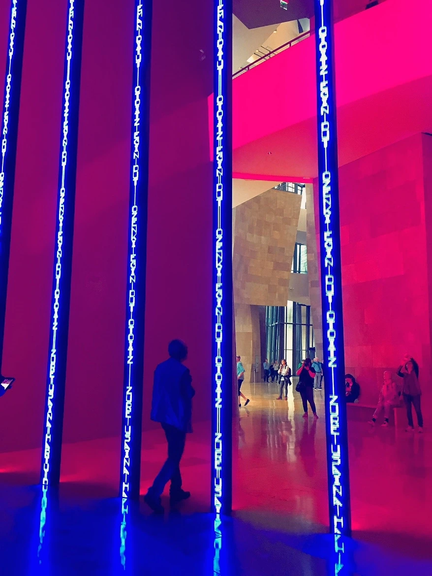 얇고 높은 LED 기둥에서 글자와 숫자가 떨어지는 제니 홀처의 <빌바오를 위한 설치 작품>도 보고, 수많은 작은 모니터에 입만 떠있는 작품도 보았다. 천장으로부터 매달려 있는 입들을 보고 무엇일까 싶어 다가갔더니 앞에 사람이 있을 때, 이를 감지해 웃음소리가 들리는 작품이었다. 모니터 앞에서 몸을 피하면 금방 웃는 소리는 멈췄다. 여러 모니터를 빠르게 지나치면 다양한 인종, 다양한 성별의 사람들의 입이 함께 웃었다. 1층을 가득 채우고 있는 리처드 세라의 <The matter of time>의 설치 작품도 인상적이었다. 크기는 물론이고 시각에 따라 작품의 모습이 달라져 자꾸 그 주위를 맴돌고 싶어 명상 공간 같은 그곳을 오래 걸었다.