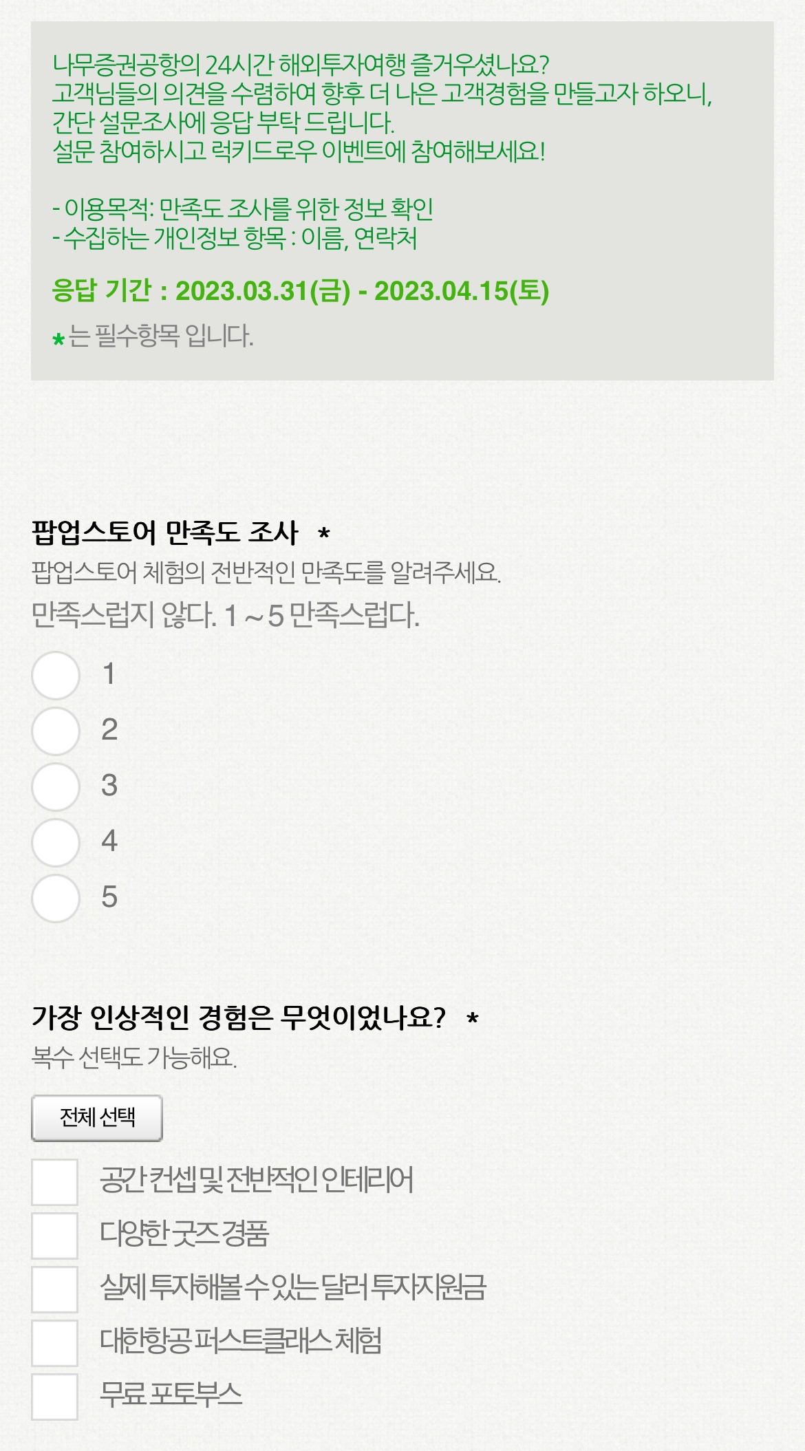 이렇게 재미있게 참여할 수 있는 이벤트만 네 개에 달하고, 이외에도 일반적인 이벤트 설문조사 참여 이벤트, 여권 스탬프 완성하기 이벤트, 팝업 사전 예약 이벤트 등을 함께 하고 있어 원하는 고객은 더 참여할 수도 있다. 일반적인 이벤트에는 참여율을 높이기 위해 나이스웨더의 제품과 같이, 고객들이 갖고 싶어 할 제품으로 경품을 구성했다.