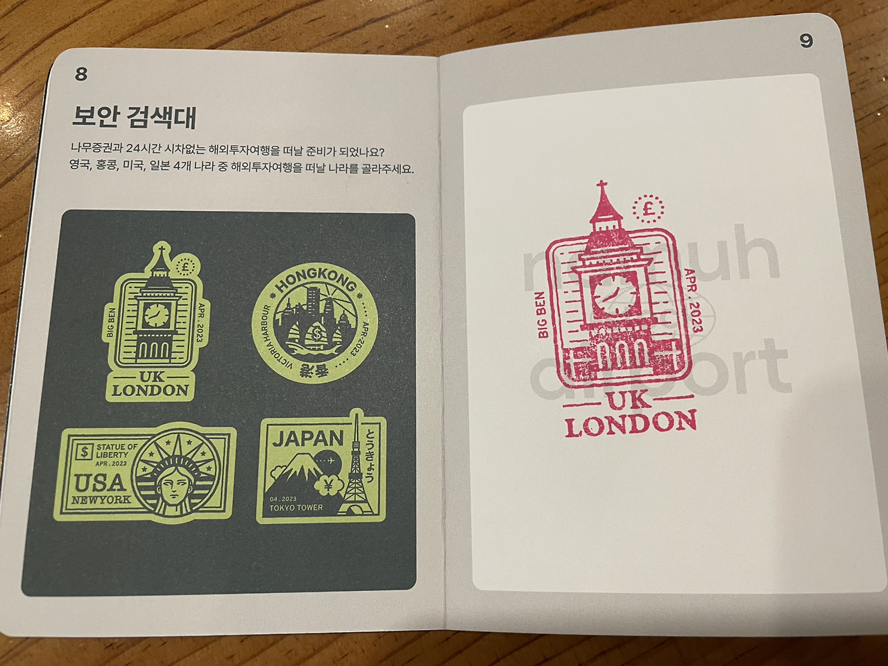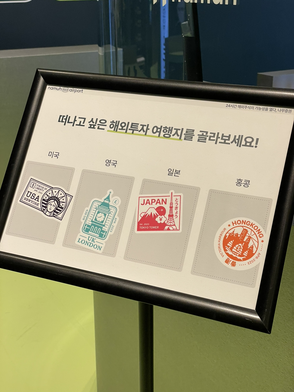 나무증권 팝업에서는 고객들이 직접 선택해 재미를 느낄 수 있도록 하는 순간이 존재한다. 첫 번째로는 '떠나고 싶은 해외투자 여행지'를 고르는 것. 고객들은 미국, 영국, 일본, 홍콩 중 해외 투자에 관심 있는 나라를 고르게 되는데 이때 고르는 나라에 맞춰 여권에 찍히는 스탬프가 달라지는 재미가 있다.