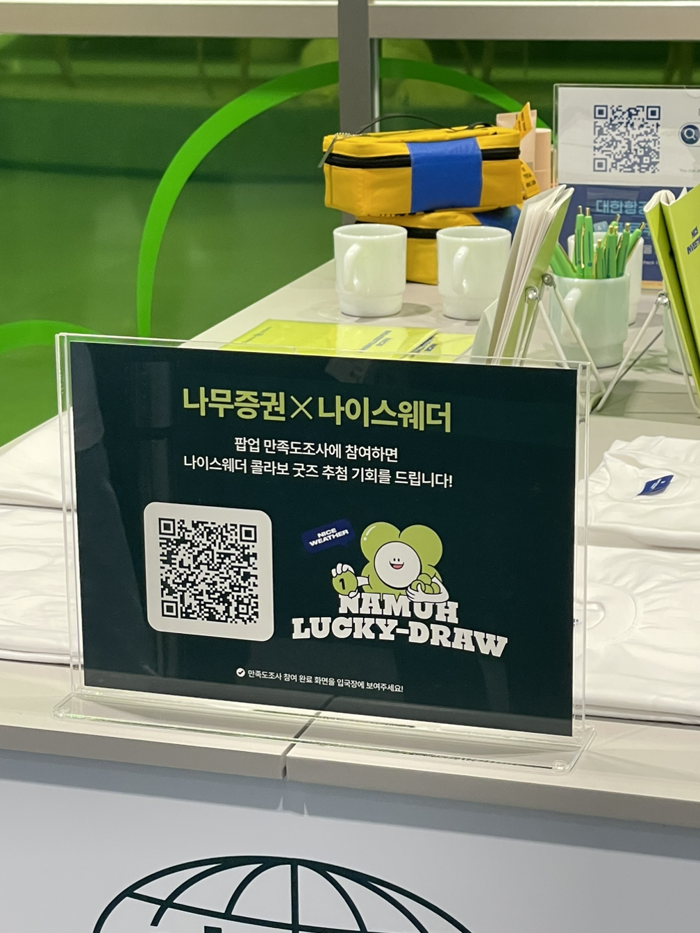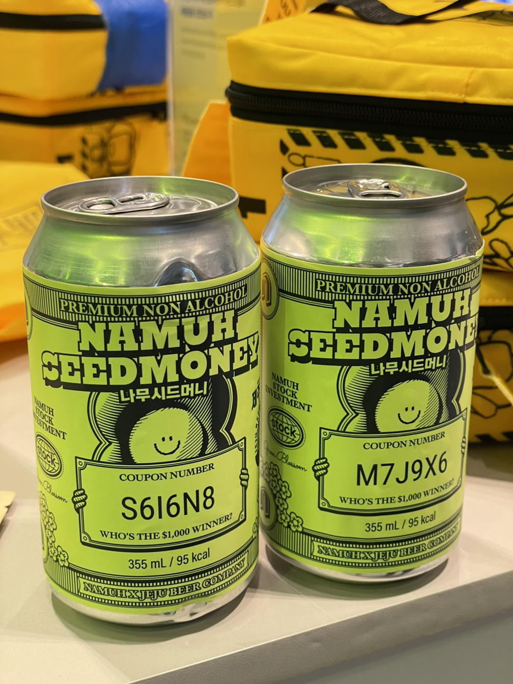 나무증권 팝업은 나이스웨더, 대한항공, 제주맥주와 함께 콜라보레이션했다. '나이스웨더'와 협업해 팝업 굿즈를 만들고 대한항공과 협업해 대한항공의 퍼스트클래스 체험을 하게 했다. 또한, 제주맥주와 협업해 행운 번호가 라벨링 된 무알콜 맥주를 고객들에게 나눠준다. 이 지점에서 세 군데의 브랜드와 협업한 이유가 극명하게 드러난다.