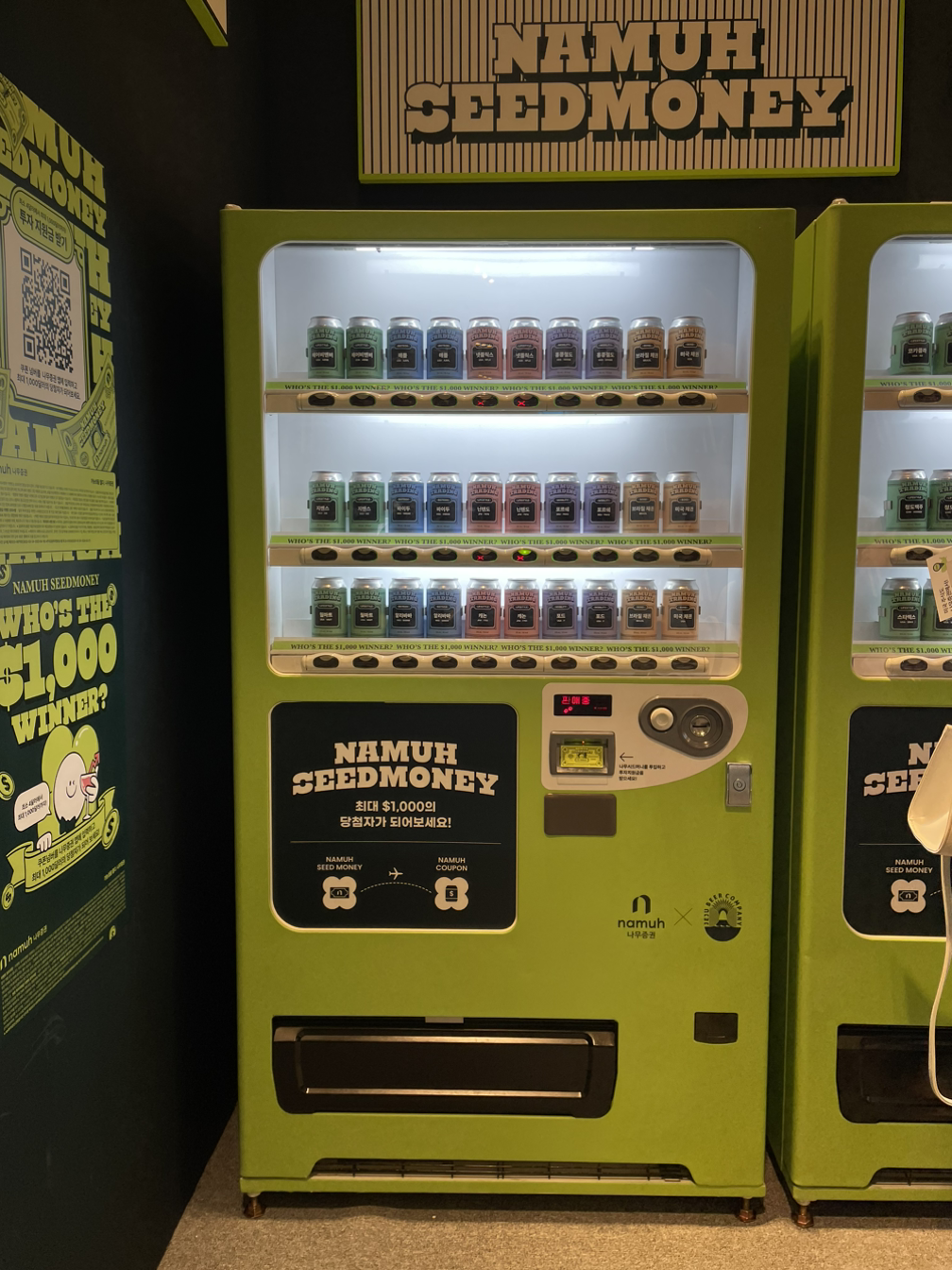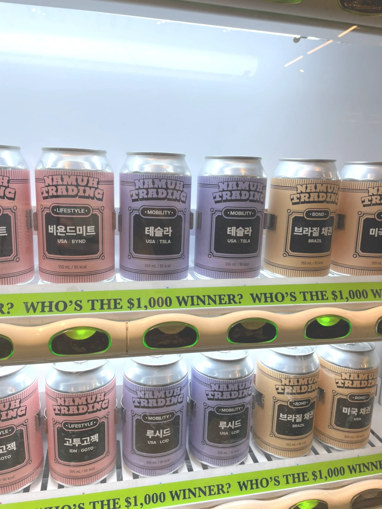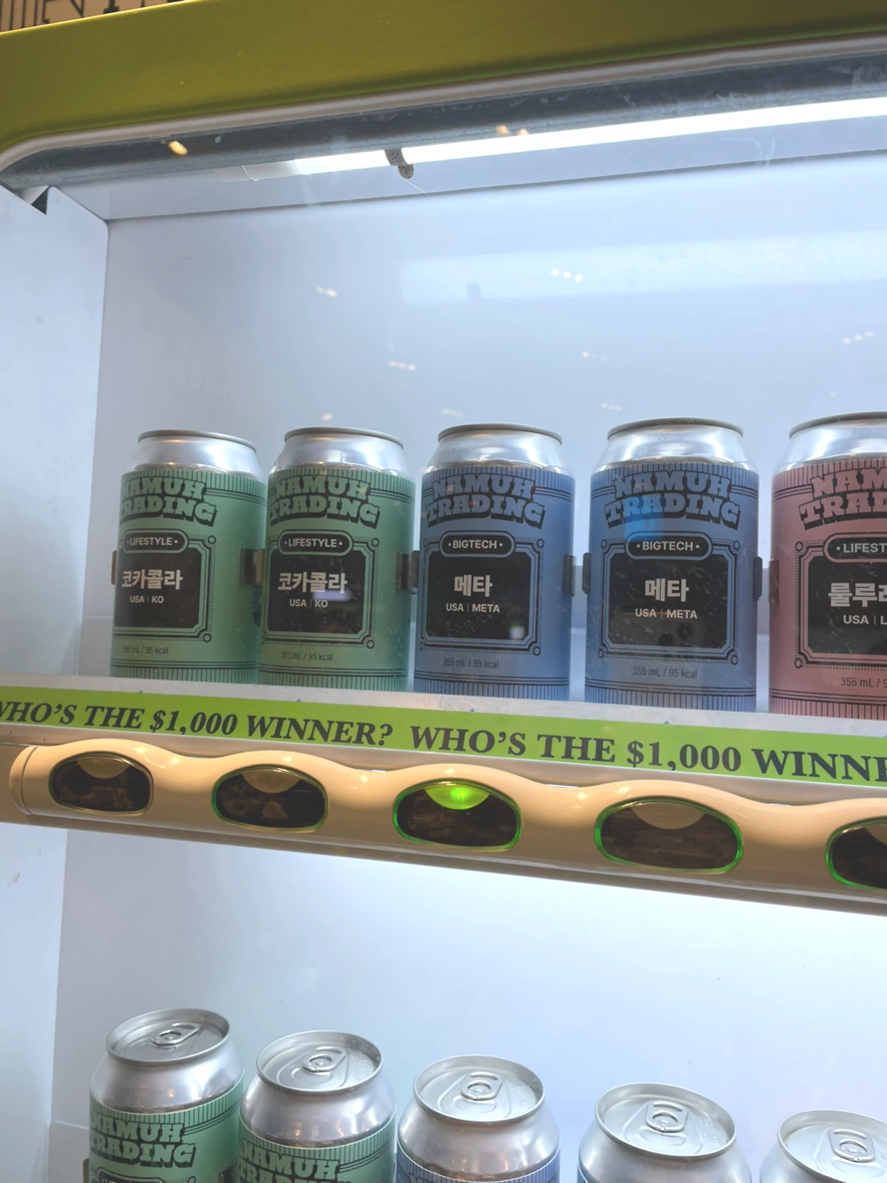 세 번째로는 코카콜라, 룰루레몬, 테슬라, 스타벅스 등 해외 투자처로 핫한 브랜드 이름이 적힌 캔이 자판기에 가득한데, 여기에 보안검색대에서 받은 연두색 시드머니 지폐를 자판기에 넣어 내가 투자하고 싶은 회사(브랜드)를 직접 뽑을 수 있다.