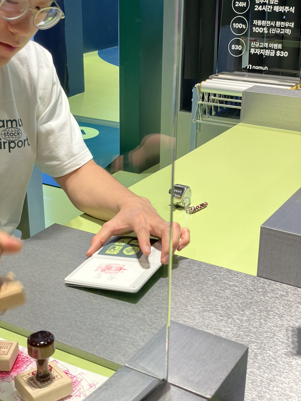 부스와 부스 간 이동도 자연스럽다. 체크인 카운터(출국장) → 보안검색대 → 환전소 → 무빙워크 → 비행기(퍼스트클래스) → 수화물도착장 → 입국장 순으로 설계되어 있는데, 여행을 할 때처럼 자연스럽게 이동하게 되고 옆 단계로 넘어가는 게 당연한 느낌을 준다. 나무증권처럼 한 부스에 여러 체험이 함께 있는 다른 팝업을 경험했을 땐, 따로 안내가 없는 경우 참여자들이 이탈하는 경우를 종종 봤는데 나무증권 팝업에서는 이탈하는 고객이 거의 없었다. 이건 긴 줄을 기다리면서도 구경하기(사진 찍기) 좋은 공항 요소를 잘 배치해 놓았기 때문에, 그리고 동선을 공항 컨셉(스토리)으로 녹여내 완벽하게 설계했기 때문에 이뤄낼 수 있던 결과라고 생각한다.