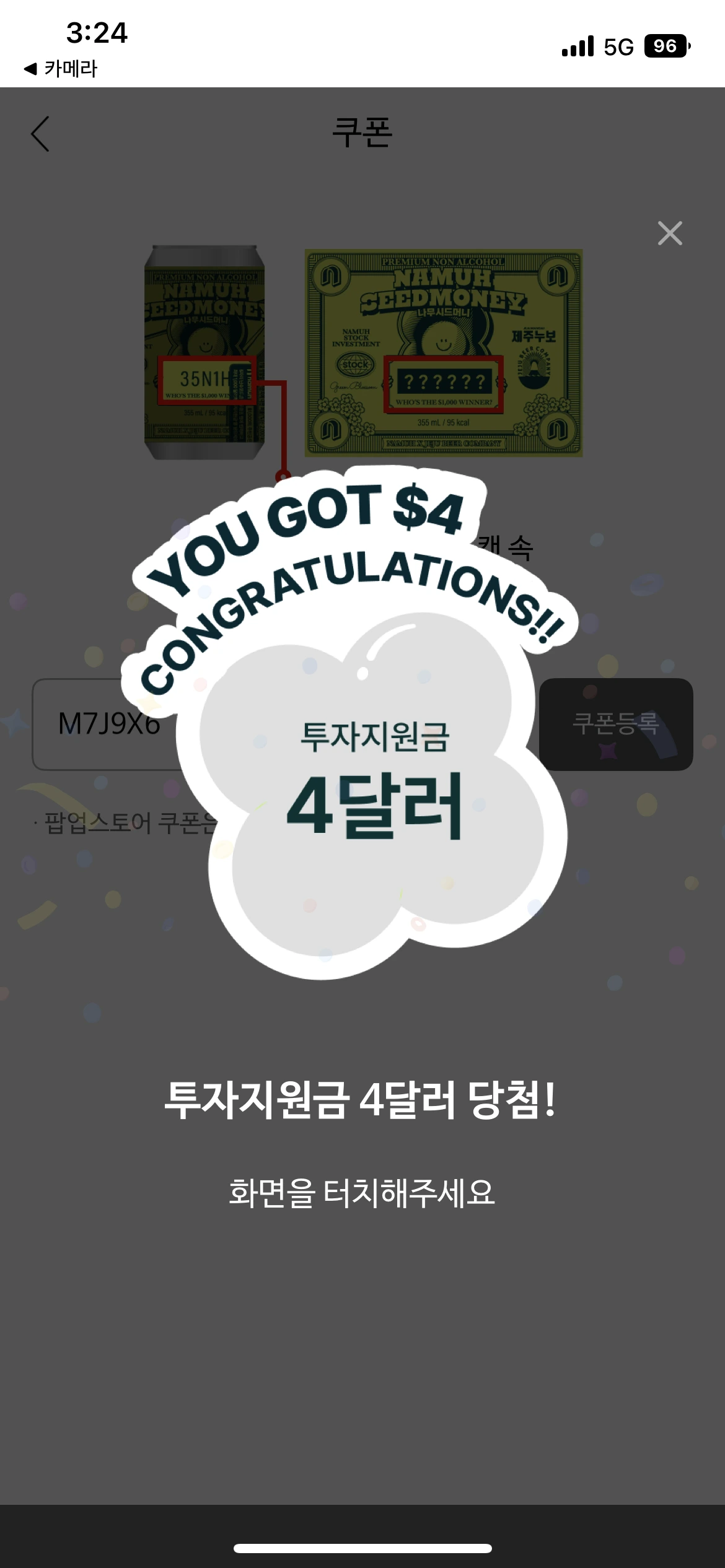 자판기로 음료를 뽑았다고 끝이 아니다. 마지막으로 행운 번호 이벤트가 있다. 음료마다 각각의 행운 번호가 있는데 그 행운 번호를 입력하면 최고 천 달러의 투자지원금을 받을 수 있다. 완전히 꽝은 없고 최소 4달러부터 시작한다.