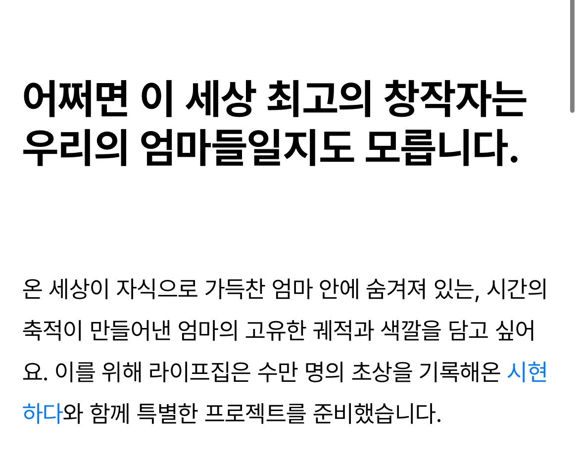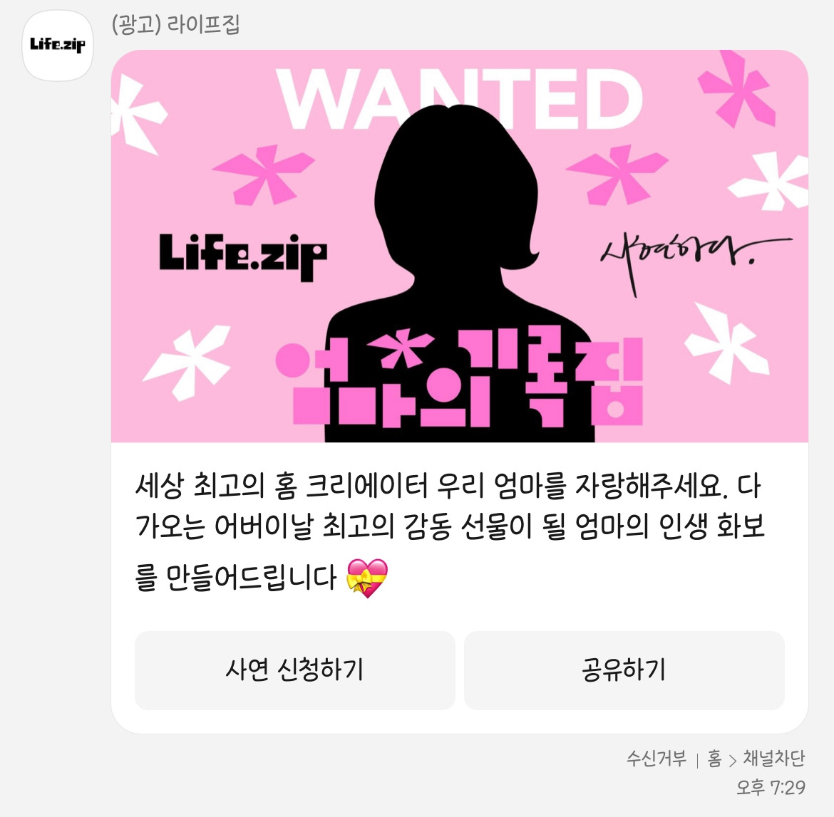 기획이 좋아서 캡처한 이벤트. 어버이날을 맞아 엄마의 홈 크리에이터 이야기를 남겨두면, 사연을 선정해 시현하다로 엄마의 모습을 담아주는 이벤트다. 라이프집의 브랜드 아이덴티티(집에서 나만의 것을 만드는 사람들의 커뮤니티)를 유지하면서도, 사람들이 생각하는 홈 크리에이터의 영역을 ‘엄마’로까지 확장시켰으며 엄마에게 의미 있는 선물을 해줄 수 있다는 점에서 이 이벤트가 정말 좋았다. 어버이날 이벤트에 진심을 담은 점도!