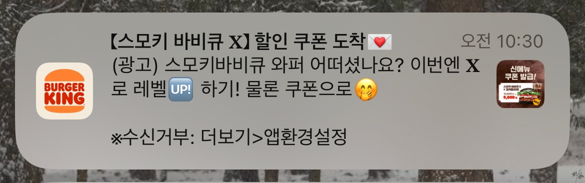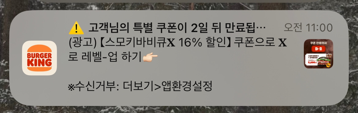 전 주 일요일에 버거킹을 가서 새로 나온 ‘스모키 바비큐 와퍼’를 먹었다. 앱에 신제품 할인 쿠폰이 있어서 할인도 야무지게 받았다. 그러고 나서 화요일(+2일 후) 오전에 앱 푸시가 왔다. 할인 쿠폰을 줄 테니 일반 와퍼 말고 X 상품으로도 도전해 보라는 것. 그 쿠폰을 쓰지 않으니 3일 후 다시 리마인더 알림이 왔다. 슬쩍 햄버거를 다시 먹고 싶은 마음이 생겼다.