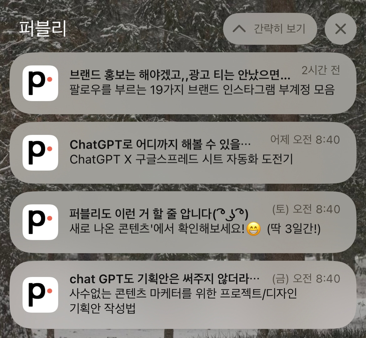 실무에 관한 인사이트 플랫폼, 퍼블리에서는 지금 사람들이 가장 궁금해하는 업무 노하우를 전한다. 여전히 화두인 챗 지피티에 관한 콘텐츠도, 인스타그램 브랜드 부계정을 모은 콘텐츠도 그렇다. ‘실무’에 초점이 맞춰져 있는 만큼 이 키워드들을 ‘기획안 작성법’이나 ‘구글스프레드 시트 자동화’로 풀어내는 점도 훌륭하다. 적당한 FOMO를 유발하면서도 호기심을 자극하는 콘텐츠라고 생각한다.