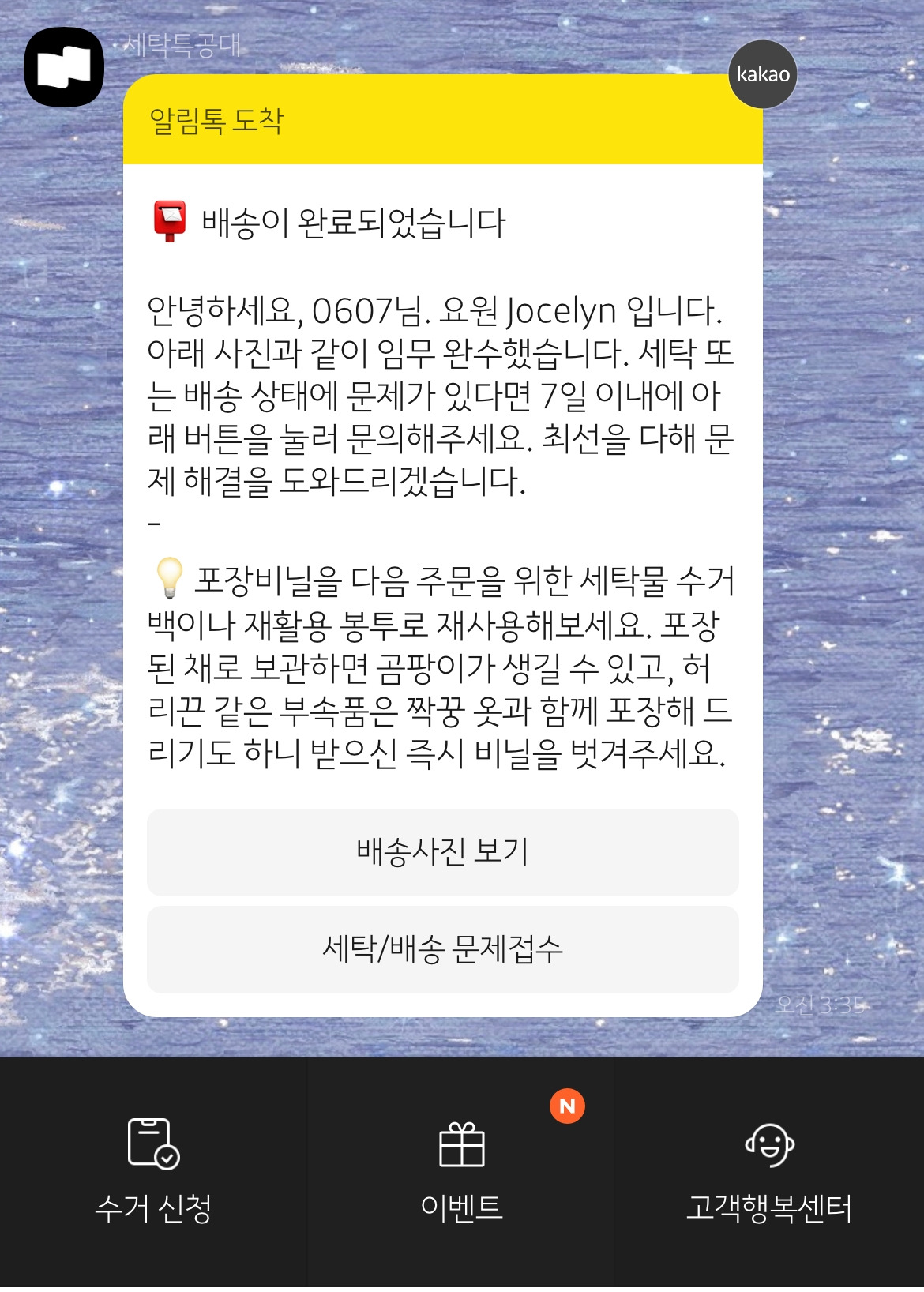세탁특공대를 정말 오랜만에 사용해 봤는데 배송 완료 메시지의 톤 앤 매너가 달라졌다. 브랜드 네임에 있는 ‘특공대’의 정체성이 드러나는 ’요원‘, ’임무 완수‘같은 단어를 사용해 정보를 전달하고 있었다.
