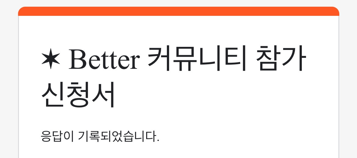 베터는 배경 컬러와 키 컬러를 브랜드에 맞게 커스터마이징 하고, 브랜드와 어울리는 특수 문자와 특수 영문 폰트를 제목 단에 사용했다. 딱 네 가지 바꿨을 뿐인데 효과는 엄청나다. 일반적인 구글 폼으로 보이지 않고, 브랜드의 콘텐츠처럼 보이는 효과가 있으니까!