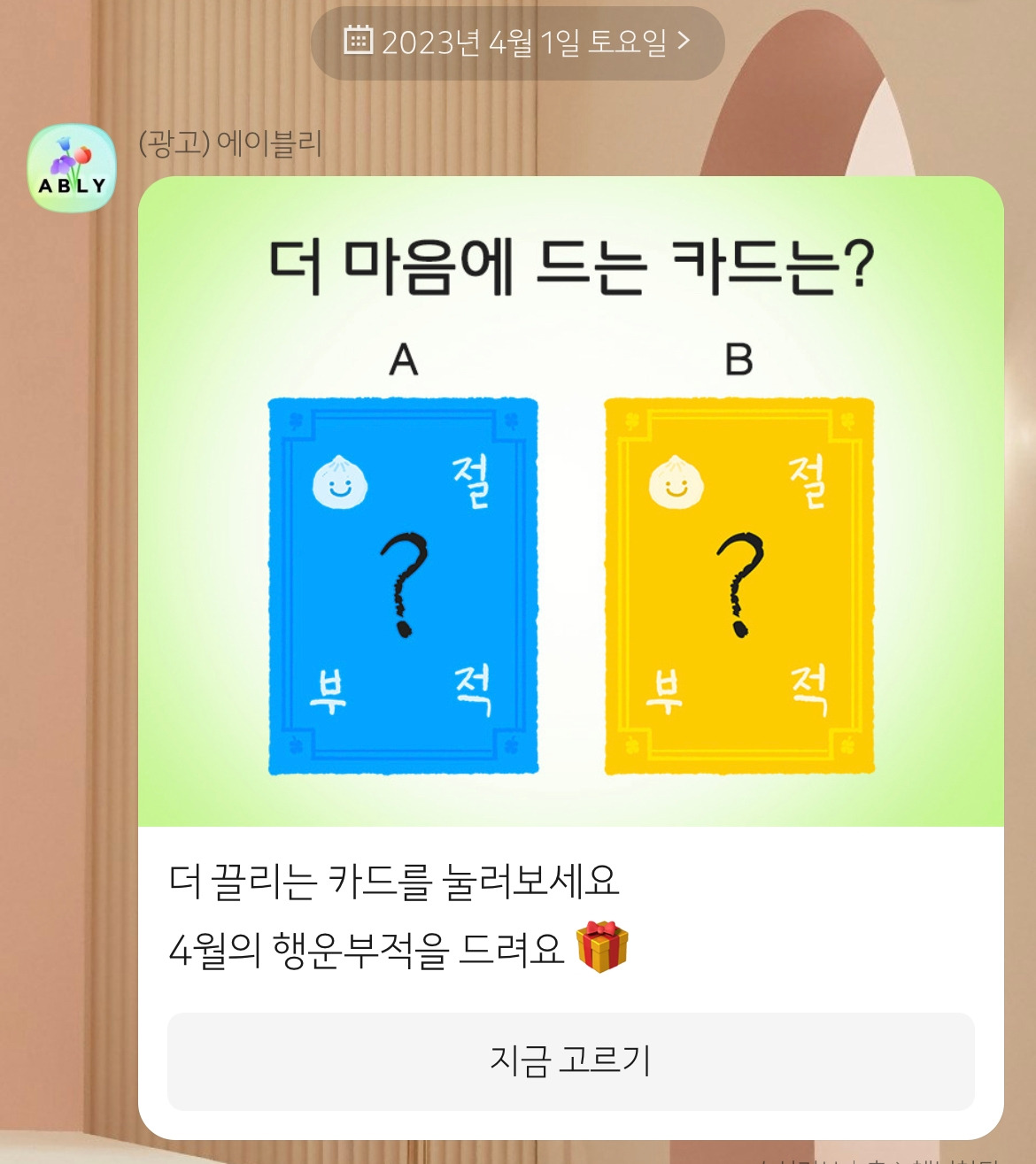 요즘 MZ세대는 부적 굿즈에 열광한다. 최고심 등의 일러스트레이터의 굿즈에서 캐릭터 부적은 쉽게 찾아볼 수 있는 효자템이다. 이 경향성을 반영해 에이블리에서 4월의 행운 부적을 만들었다. 직접 선택하게끔 옵션을 주기도 했다. 하나만 있으면 모르겠는데 둘 중에 선택하라고 하면 눌러보고 싶기 마련. ‘행운’을 준다는 말도 이럴 때는 힘이 세다. 클릭률이 높았을 것 같았던 카카오톡 메시지.