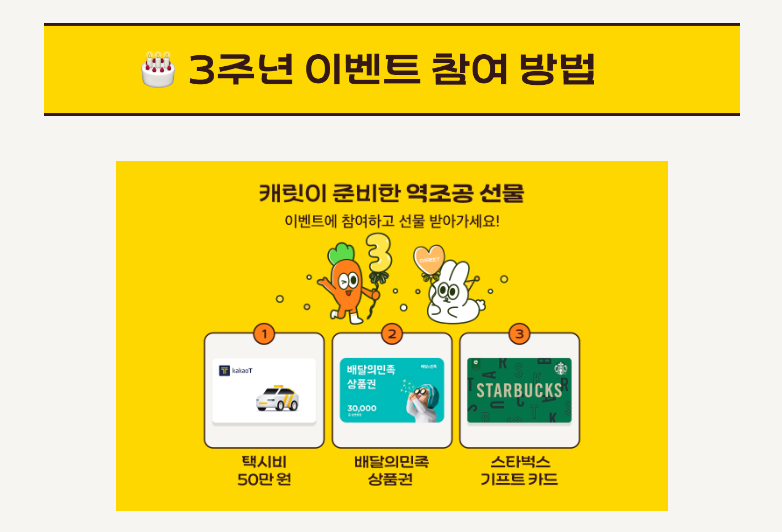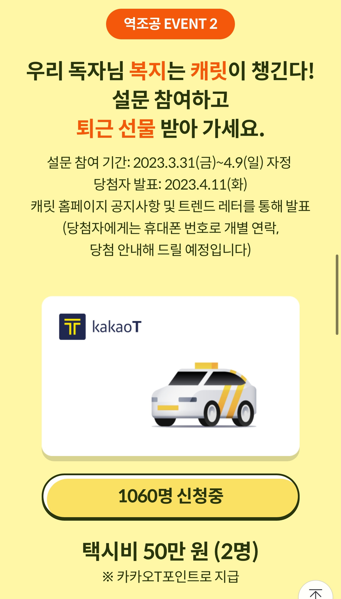 이벤트 경품의 좋은 예라고 생각한다. 배달의민족 상품권이나 스타벅스 기프트 카드는 종종 경품으로 보았지만 택시비 50만 원을 경품으로 주는 건 흔하지 않아서 인상 깊었다. 1명이 아닌 2명에게 준다는 점, 현재까지 몇 명이 신청했는지 보여주고 있다는 점, 설문만 참여하면 누구나 이벤트에 참여할 수 있다는 점이 고객들의 많은 참여를 이끌어낼 수 있을 것 같다. 이벤트 경품을 주는 행위를 MZ 세대의 눈높이에 맞게 ’역조공‘으로 표현하는 점도 캐릿다웠다.
