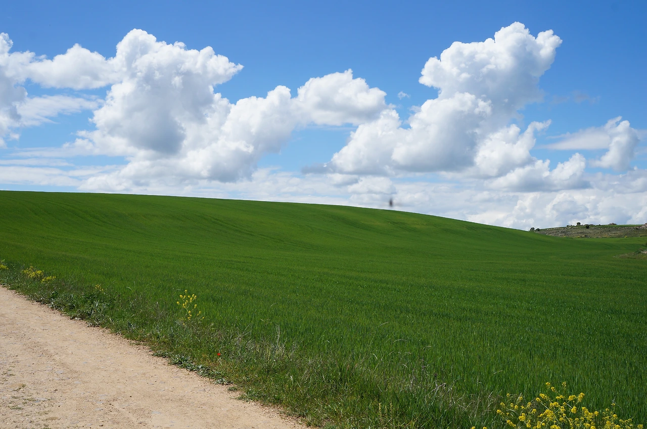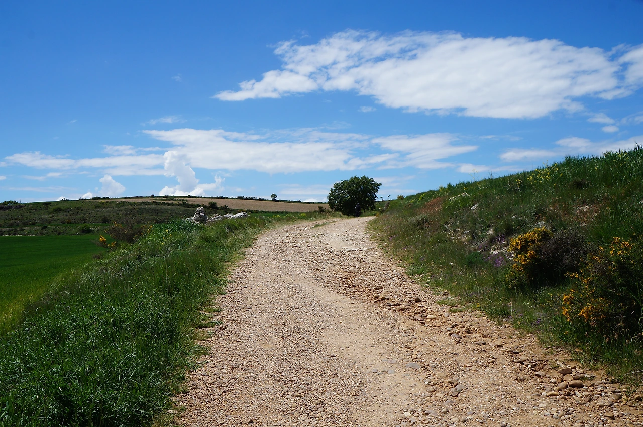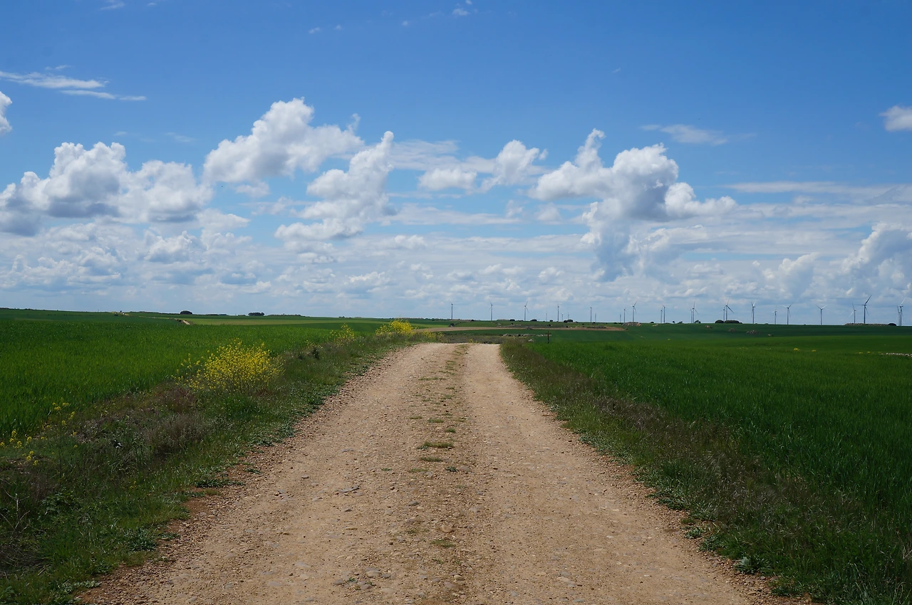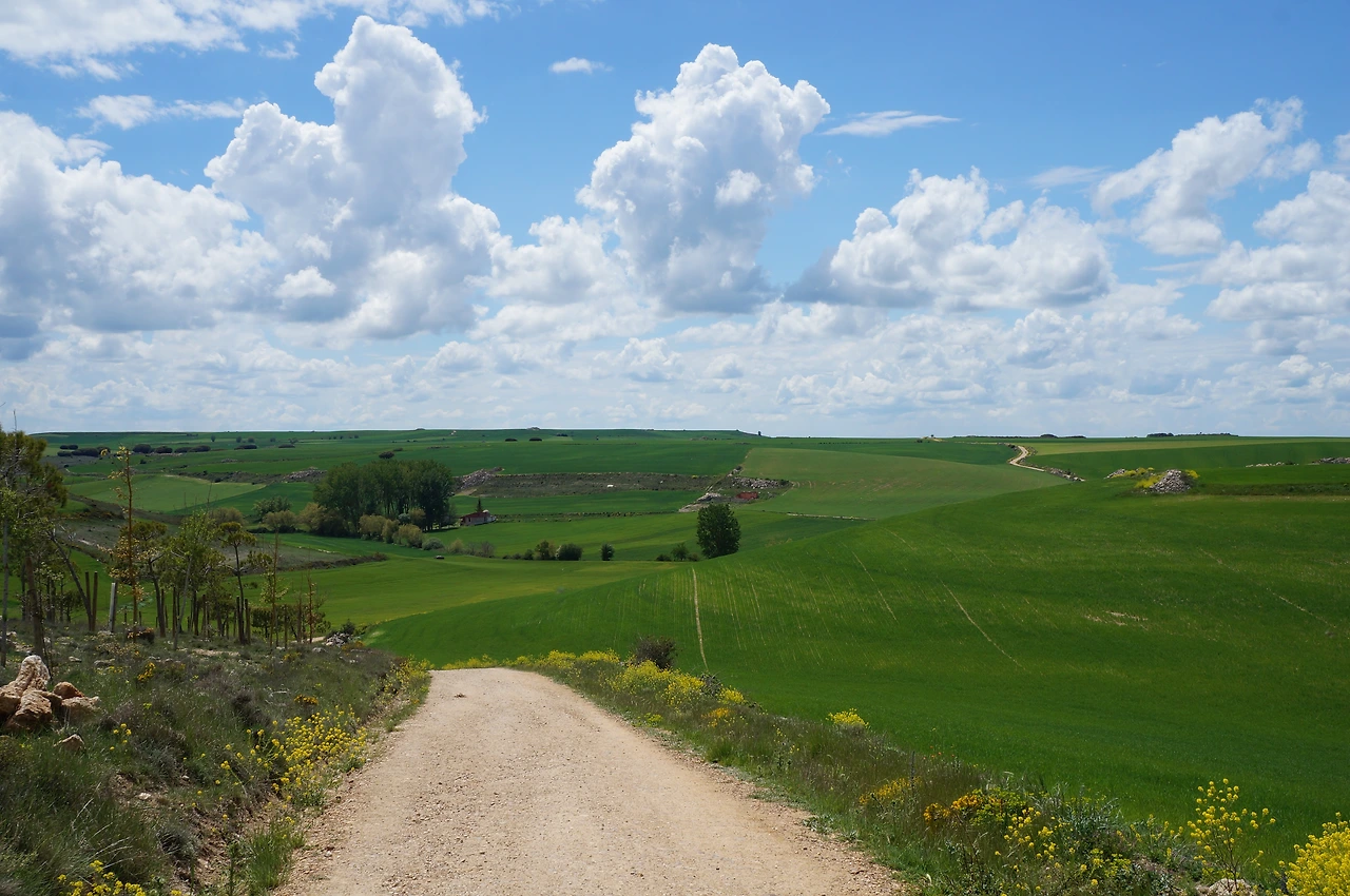 군데군데 피어있는 노랗고 빨간 들꽃에, 언덕을 넘으면 또 다른 색깔로 펼쳐지는 들판에, 또 다른 언덕을 넘으면 모습을 바꾸는 하늘에 수 천 번쯤 경탄했을까. 이제는 윈도우 바탕화면 같은 비현실적인 경관이 눈에 보였다. 그래픽이라고 해도 믿을만한 오차 없는 언덕의 곡선과 하늘이었다. 여기서는 정말 걷기가 싫었다. 사람들도 여기서는 아예 작정하고 배낭을 내려놓고 사진을 찍기 시작했다. 산티아고 순례길을 걸으면서 은근 사람들이 사진을 찍는 모습을 잘 보지 못했는데 이곳은 다들 어쩔 수 없었나 보다. 여기저기서 분주한 셔터 소리가 났다. 따가운 햇볕 아래였지만 모두가 눈을 접어 환하게 웃고 있었다.