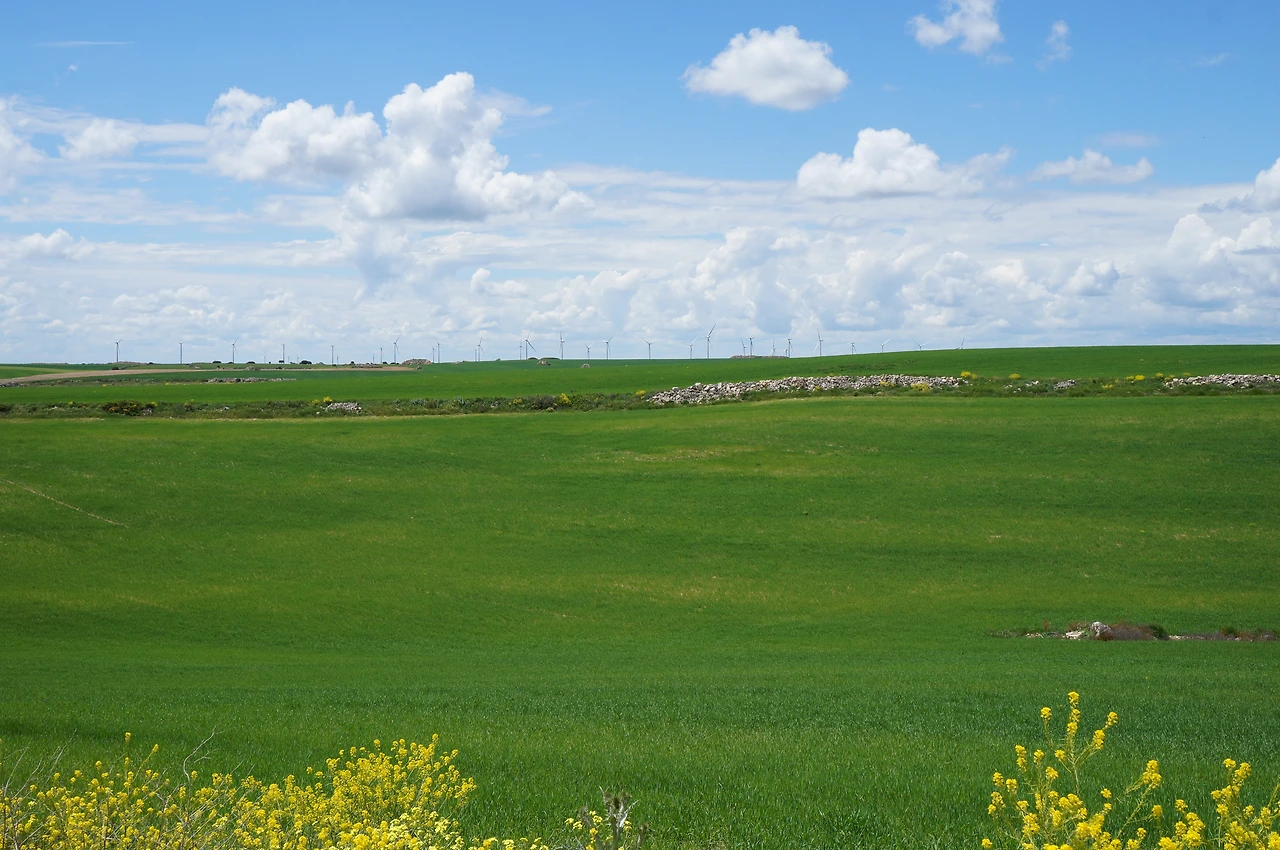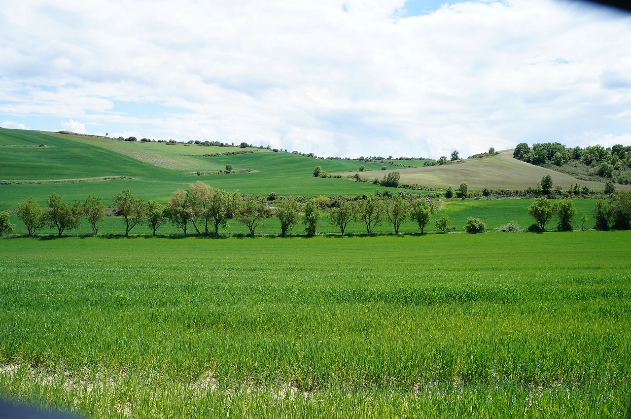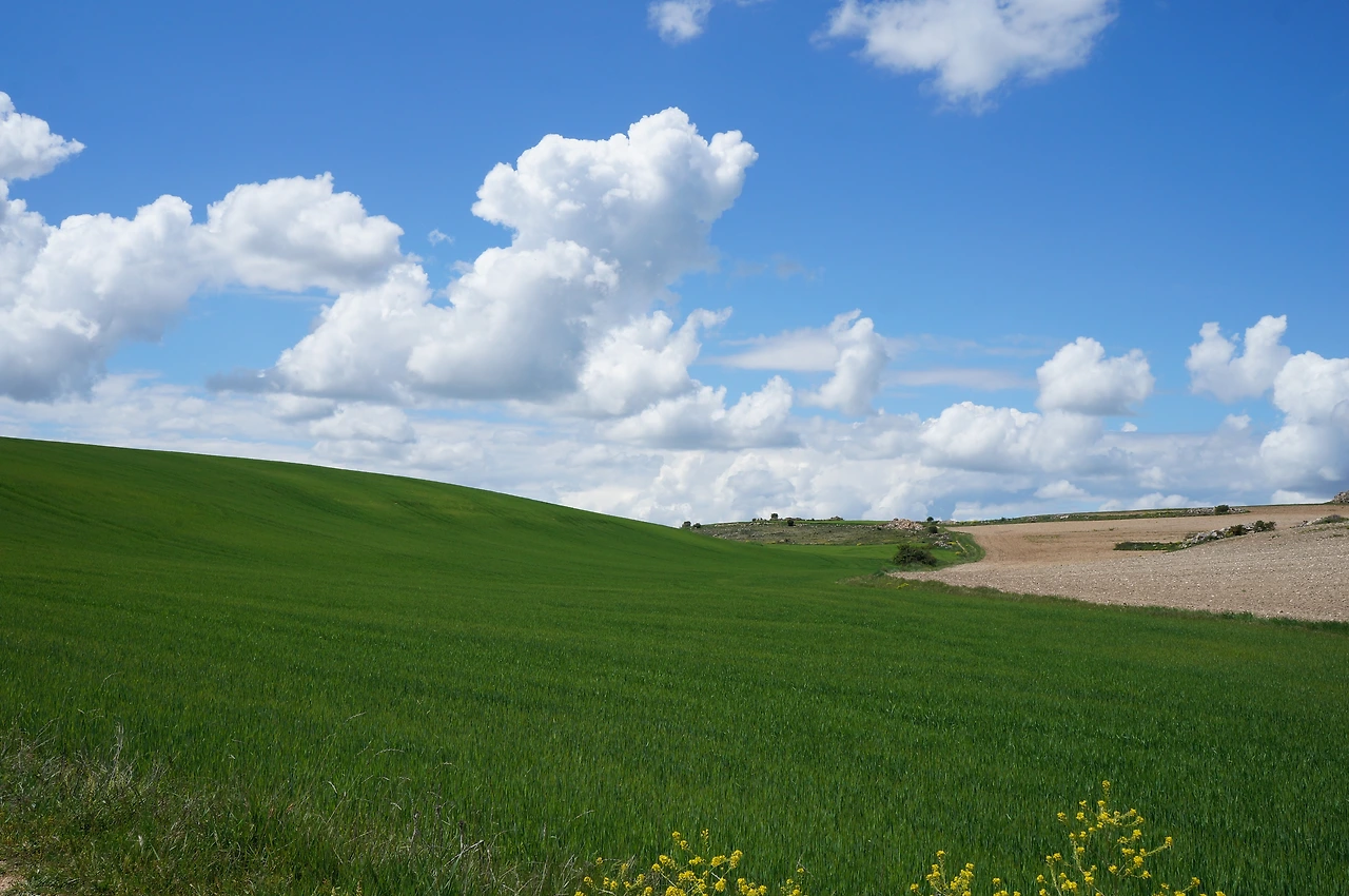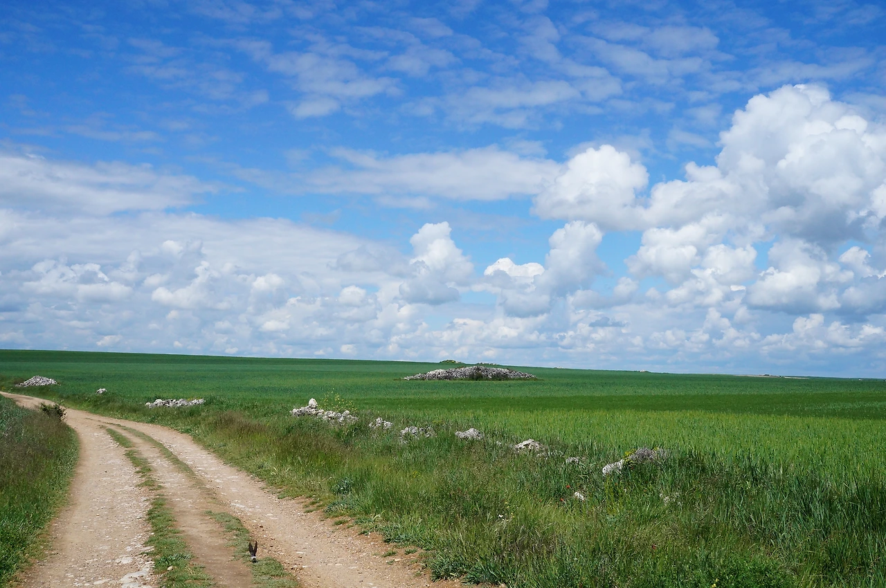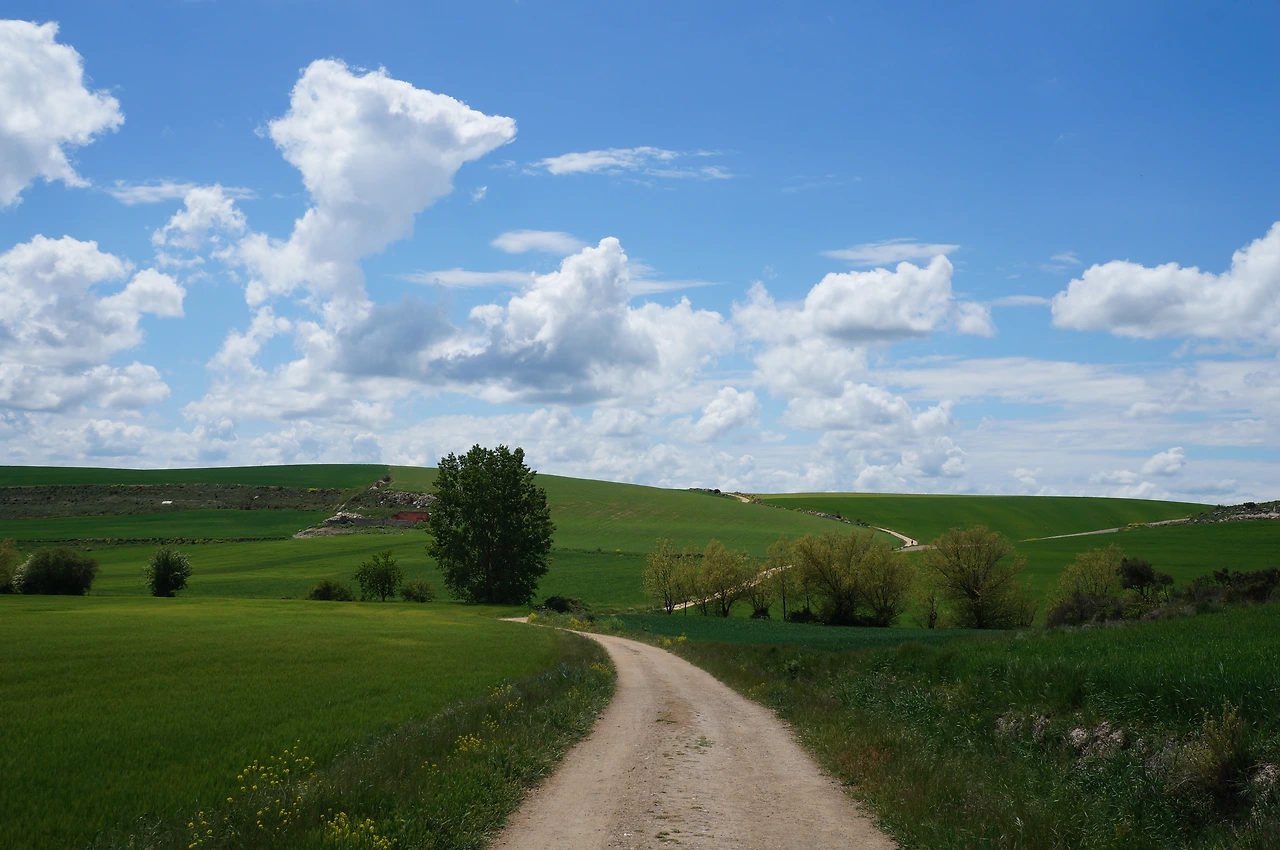 군데군데 피어있는 노랗고 빨간 들꽃에, 언덕을 넘으면 또 다른 색깔로 펼쳐지는 들판에, 또 다른 언덕을 넘으면 모습을 바꾸는 하늘에 수 천 번쯤 경탄했을까. 이제는 윈도우 바탕화면 같은 비현실적인 경관이 눈에 보였다. 그래픽이라고 해도 믿을만한 오차 없는 언덕의 곡선과 하늘이었다. 여기서는 정말 걷기가 싫었다. 사람들도 여기서는 아예 작정하고 배낭을 내려놓고 사진을 찍기 시작했다. 산티아고 순례길을 걸으면서 은근 사람들이 사진을 찍는 모습을 잘 보지 못했는데 이곳은 다들 어쩔 수 없었나 보다. 여기저기서 분주한 셔터 소리가 났다. 따가운 햇볕 아래였지만 모두가 눈을 접어 환하게 웃고 있었다.