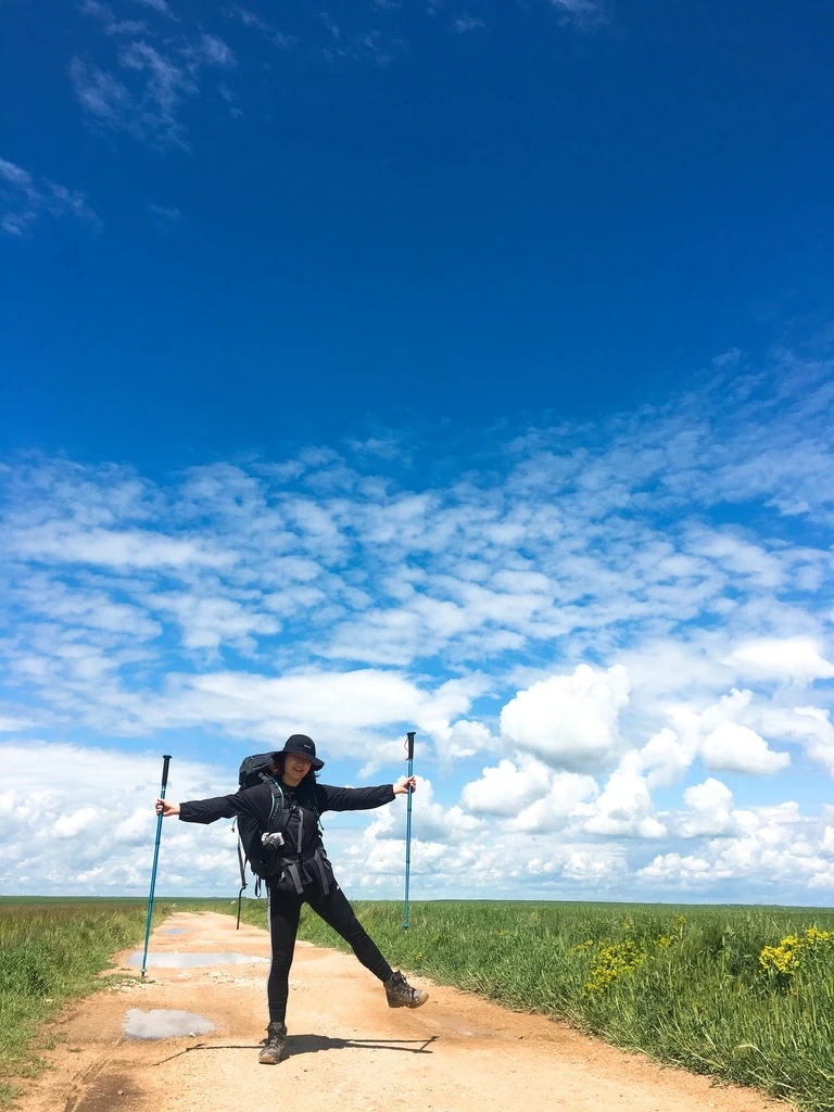 도수가 센 술을 한 잔 때려 먹고 걷는 기분은 '째진다'라는 말로 표현할 수밖에 없다. 얼굴도 몸도 후끈후끈하지 아직 술의 향이 입과 코에 맴돌지. 여기가 바로 천국 같다. 한껏 술과 행복에 취해 걷고 있는데 진짜 천국 같은 풍경이 눈앞에 펼쳐지기 시작했다. 간간이 보이던 낮은 건물들은 모두 사라지고 양옆으로 초록초록한 풀밭이 펼쳐졌다. 구름은 낮게 내려와 드넓은 하늘을 드리웠다. 하늘은 지금까지 걷는 중 가장 파란 모습을 보여주고 있었다. 이렇게 하늘은 푸르르고 구름이 예쁘게 보였던 날이 없었다.