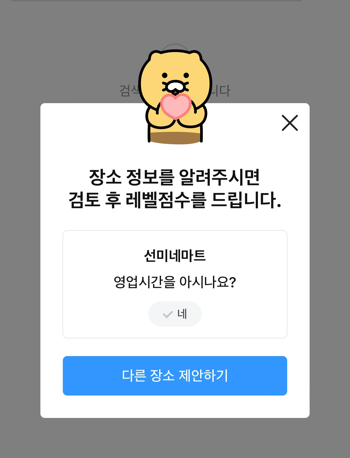 카카오맵에 없는 장소를 새롭게 등록 요청했는데, 다 끝나니 내가 최근에 별점을 남긴 음식점의 추가 정보를 혹시 알고 있냐는 팝업이 떴다. 이미 알고 있는 곳이고 좋은 별점을 준 식당이라 자연스럽게 추가 정보를 남기고 싶은 마음이 들었다.