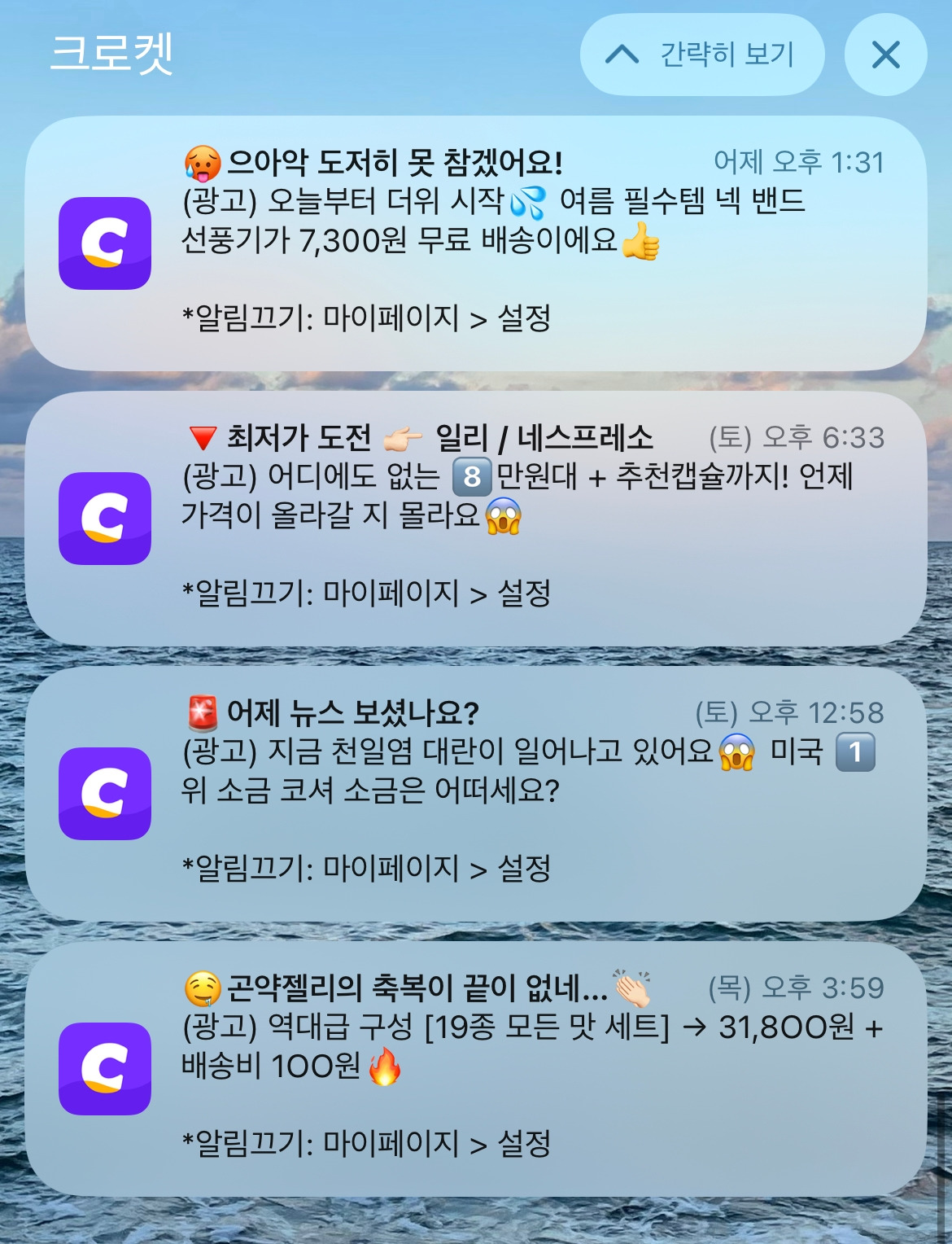 해외 직구 플랫폼 크로켓의 푸시가 그 어떤 푸시 알림보다 지금 트렌드를 잘 읽고 있는 것 같다. 유행어가 있으면 소멸되기 전에 빠르게 푸시에 섞어 쓰고(~축복이 끝이 없네), 지금 이슈(천일염 대란)를 푸시에 풀어내기도 한다. '으아악 (더위) 도저히 못 참겠어요'라는 푸시는 한참 더울 오후 한 시 삼십 분에 왔다. 의도했는지는 모르겠지만 직장인들이 점심을 먹고 회사에 들어가 더위를 식히고 있거나, 이동 중이라 더위를 느끼고 있을 시점이기도 하다. 시점과 메시지, 그리고 CTA까지 완벽한 푸시 알림!