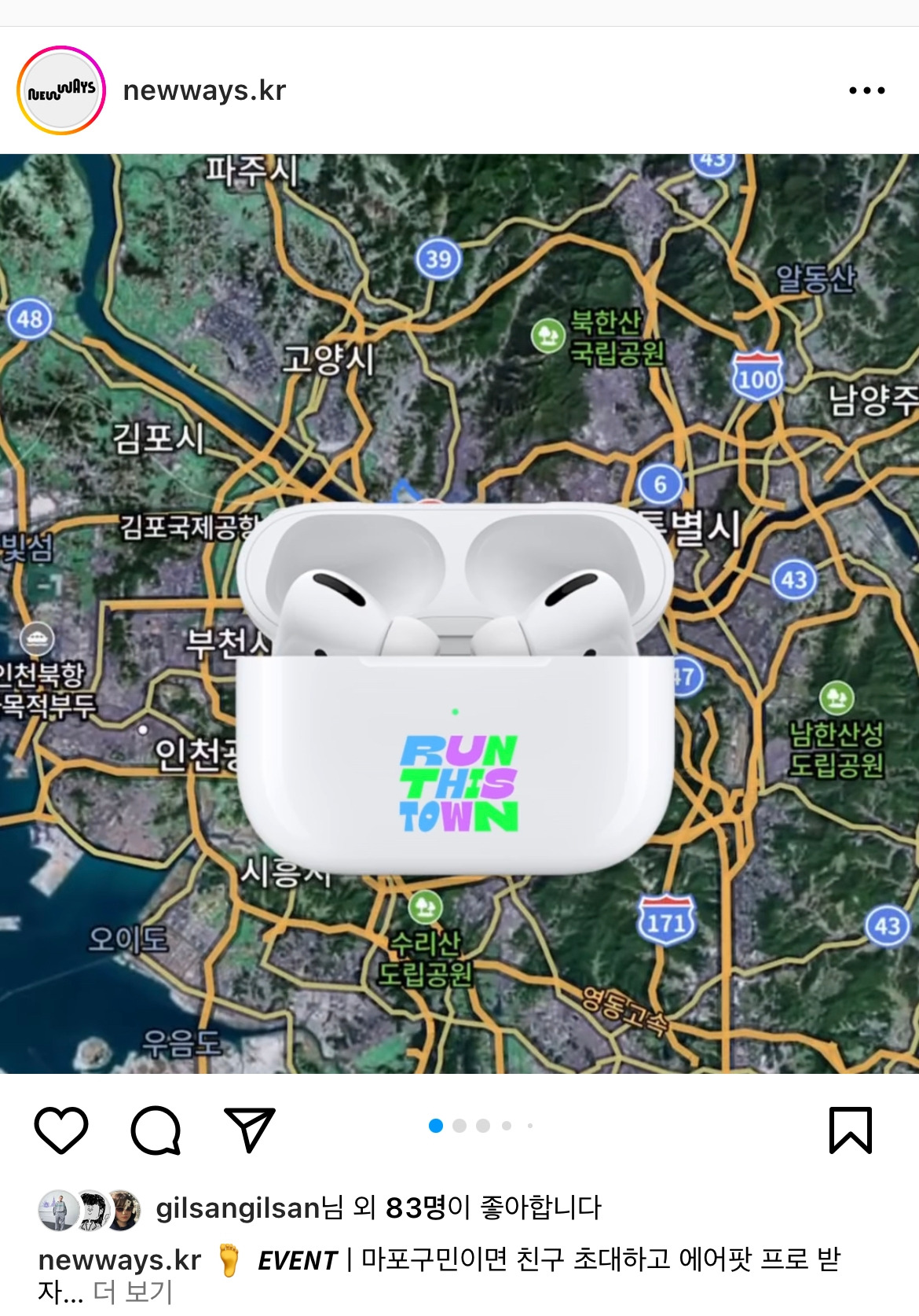 젊은 정치인을 양성하고 지원하는 뉴웨이즈에서 서울 마포구민 대상으로 진행하는 이벤트를 홍보하기 위한 인스타그램 콘텐츠다. 이벤트 경품인 에어팟을 가운데 두고 한국 전도가 나왔을 때부터 줌인해서 마포구까지 확대하는 형식의 릴스인데, 만드는데 진짜 얼마 걸리지 않았을 것 같지만 메시지가 명확하고 사람들의 눈길을 끌만큼 재미있어서 캡처했다. (게시물 보러 가기)