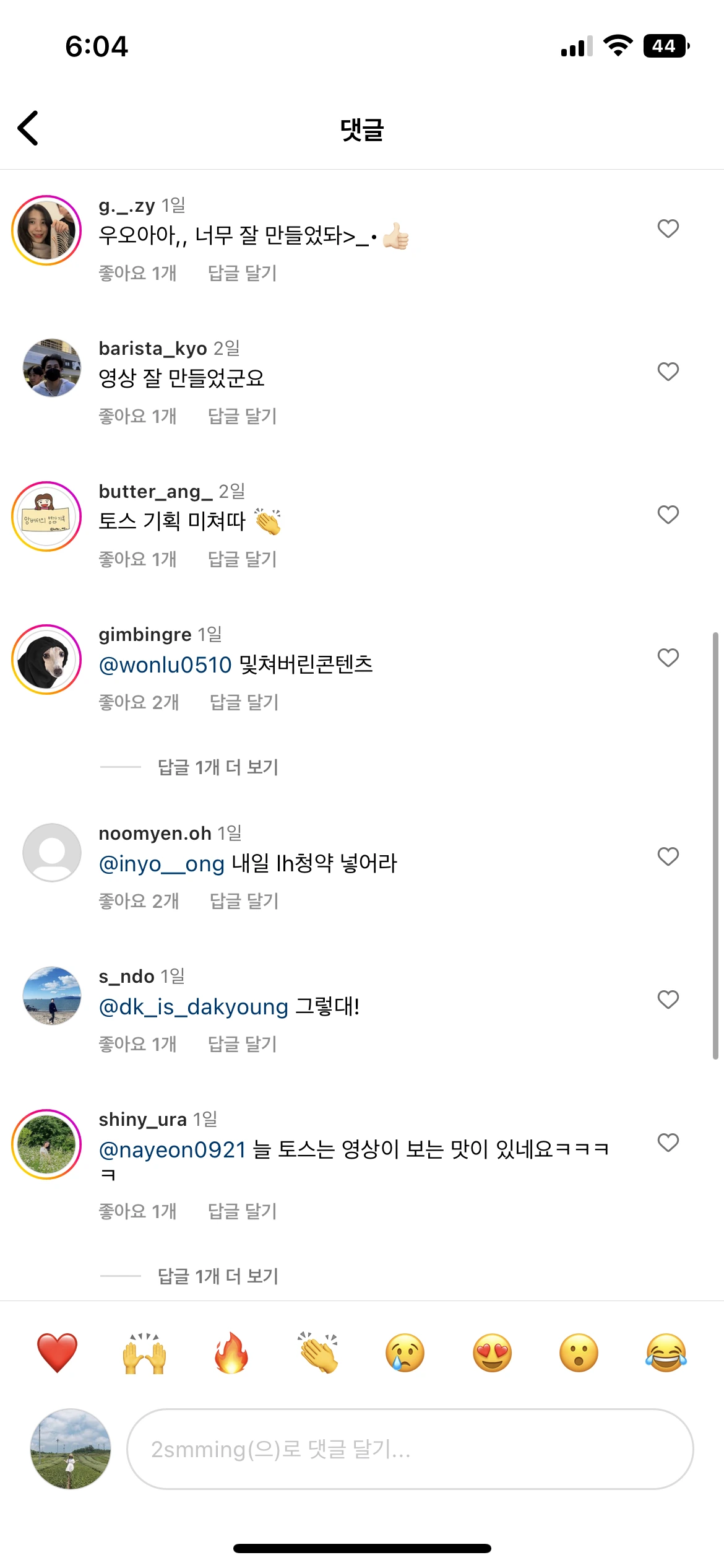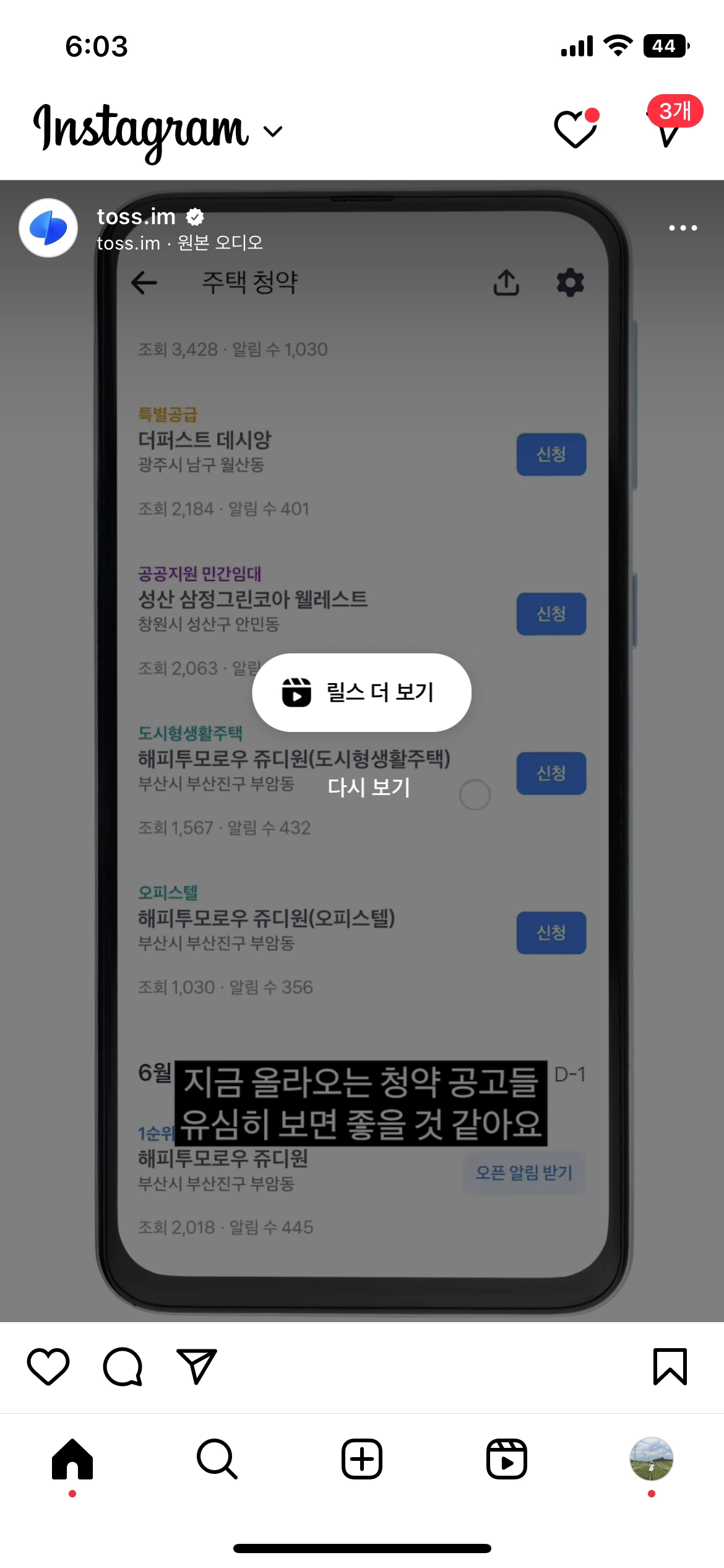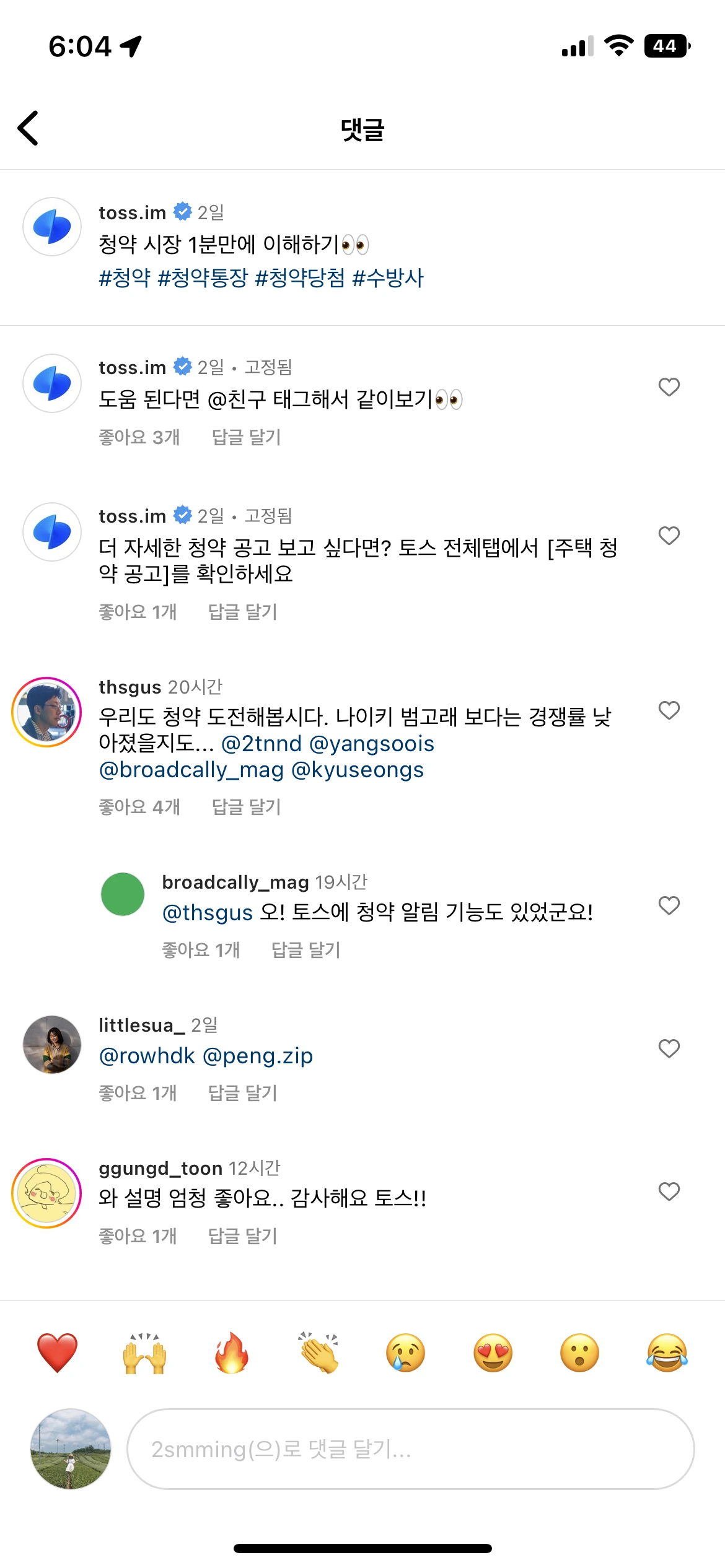 맨 마지막에는 토스의 청약 알림 신청 페이지를 보여준다. 특별공급, 공공지원 민간임대, 오피스텔 등 다양한 청약 매물들과 알림 신청 버튼이 보인다. 지금까지 나도 청약 정보는 청약 인스타그램 인플루언서나 유튜버를 통해 빠르게 얻을 수 있는 줄 알았는데 토스에서도 볼 수 있다는 사실은 몰랐다. 아마 이 콘텐츠는 토스에서도 주택 청약 알림을 받을 수 있다는 사실을 알리려고 제작된 것 같은데 소기의 성과는 이미 달성한 듯하다. 게시물에 '토스에 청약 알림 기능도 있었군요!' 같은 댓글이 이미 달려있다.